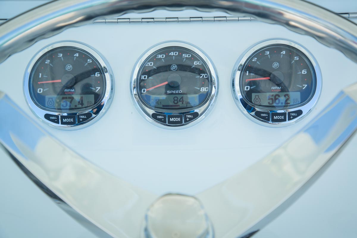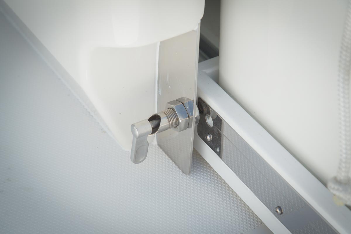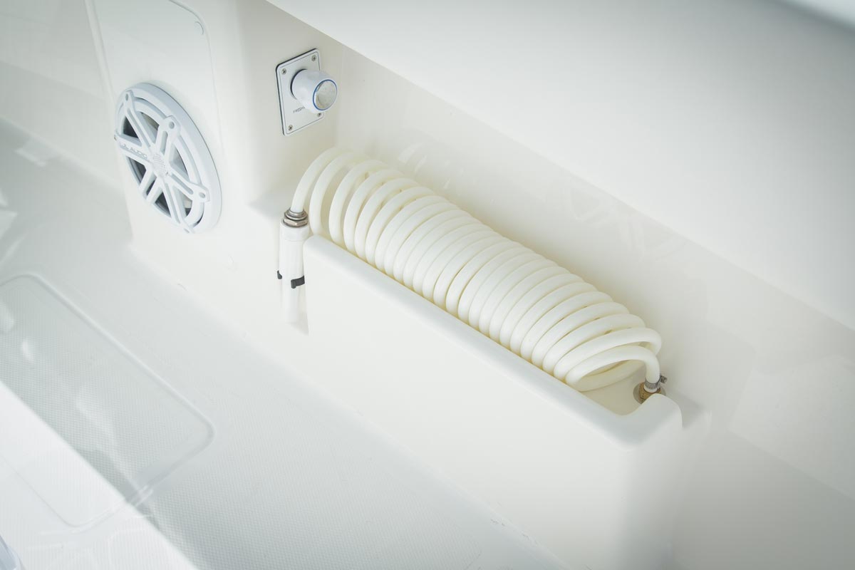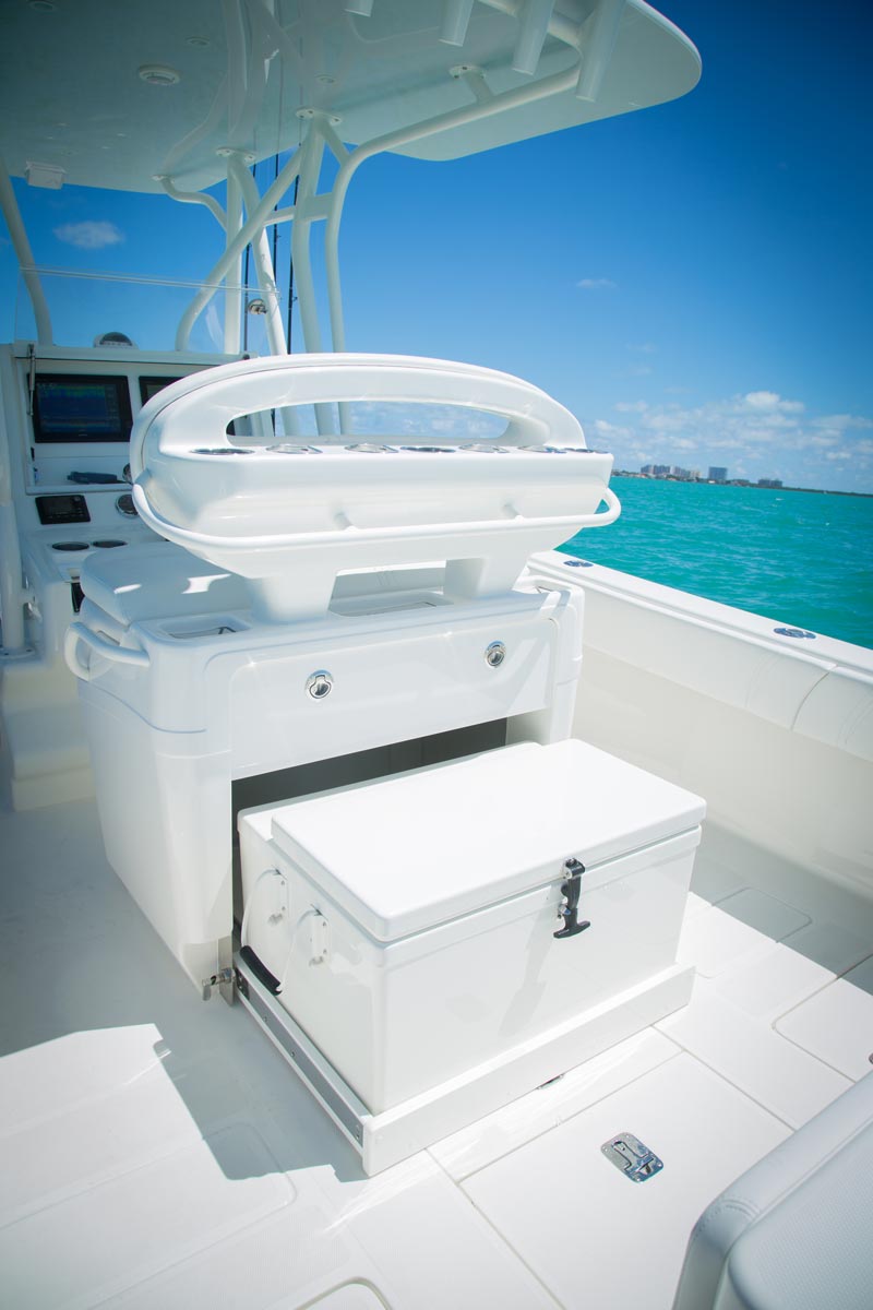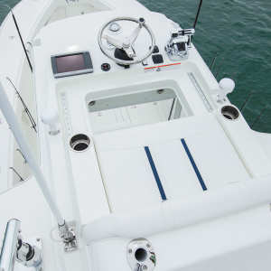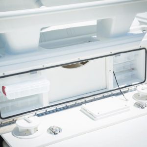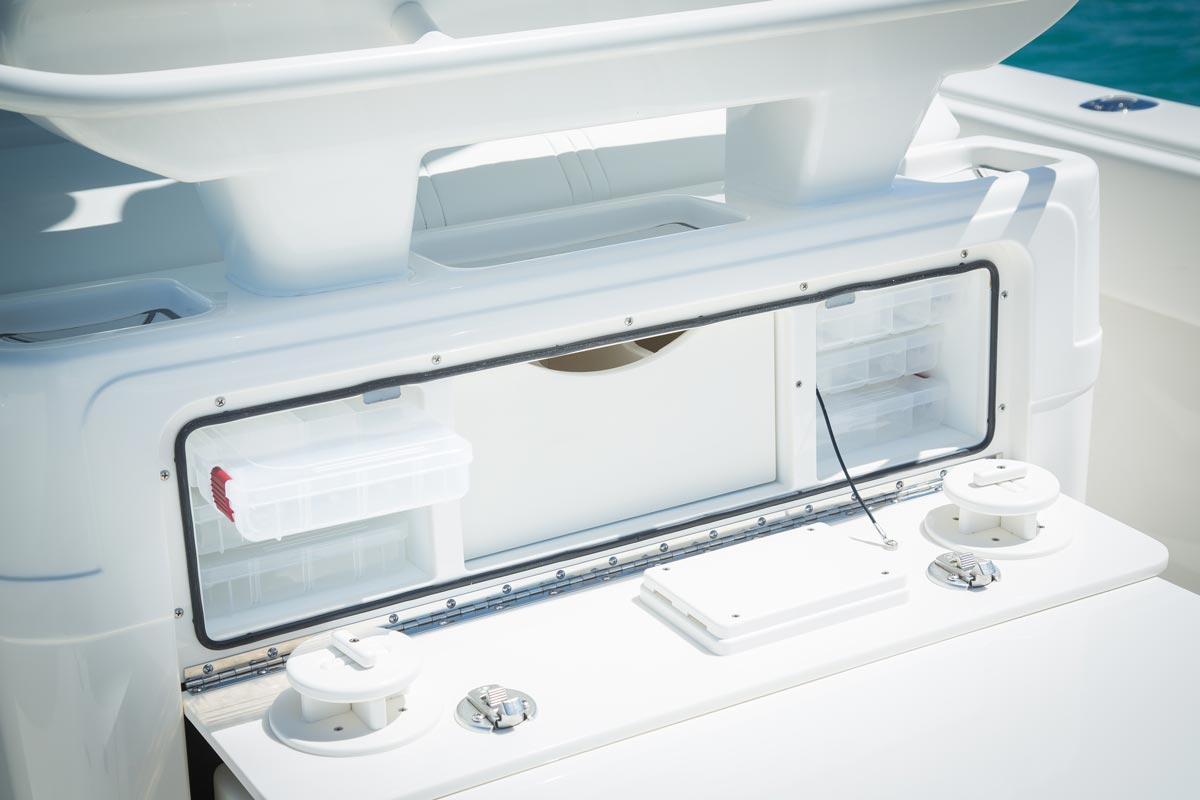 The console door is located on the front, allowing the sides of the console to be used for out-of-the-way rod storage. The interior houses battery switches, a breaker panel, access to electronics and batteries, and it can be outfitted with an optional marine head.