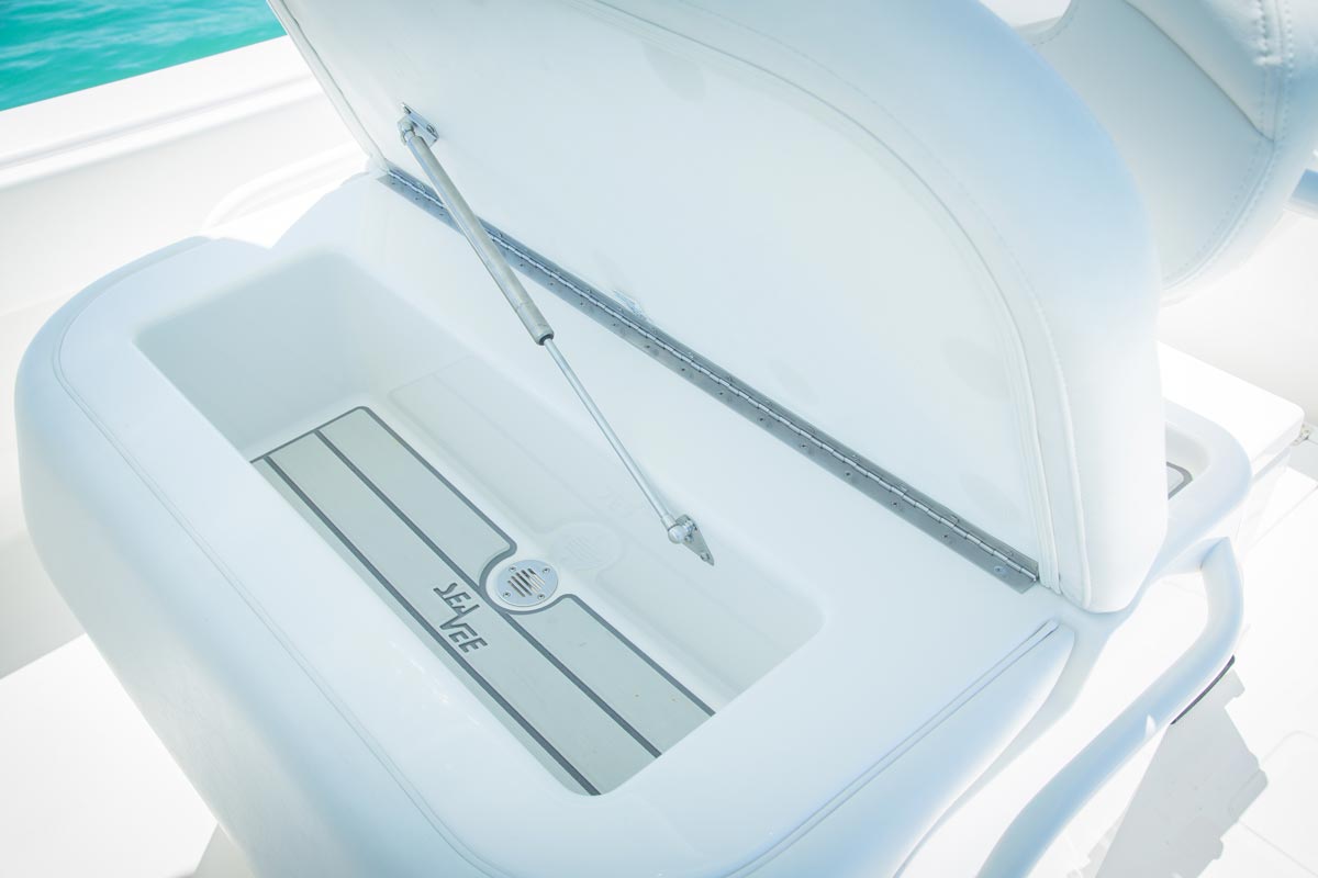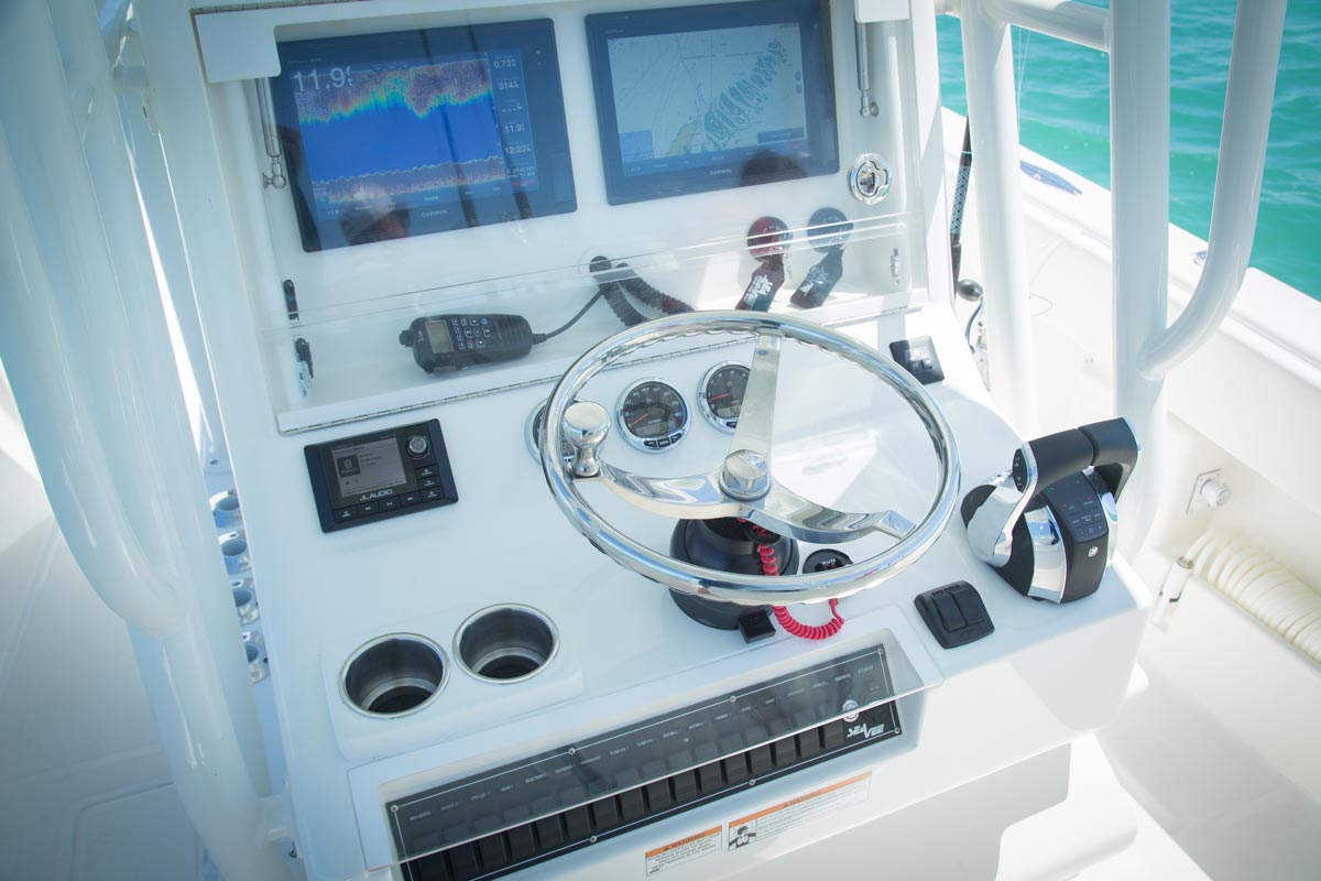 The SeaVee 290B features a large, ergonomic center console with plenty of space to mount two 12″ navigation units side by side with room to spare for a VHF, head unit and ignition key switches. A splash cover protects vital electronics and an array of switches that controls onboard accessories is within easy reach.