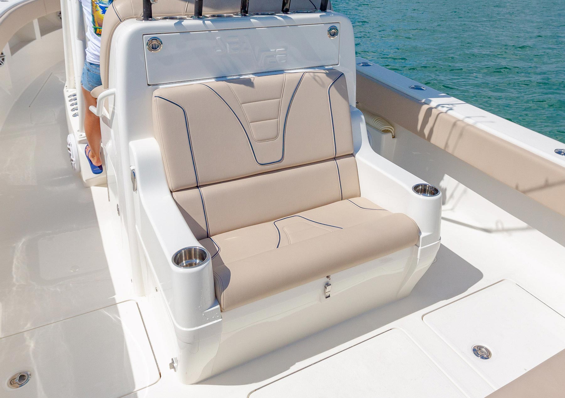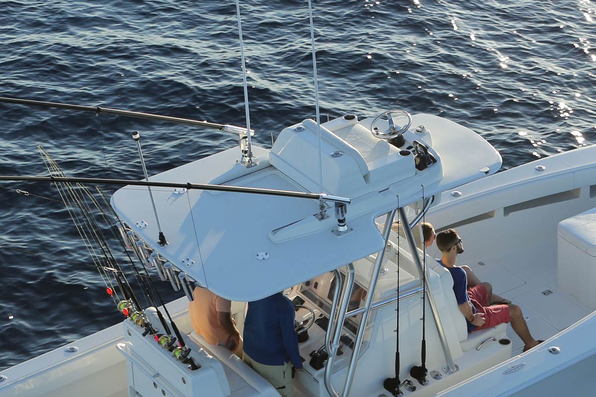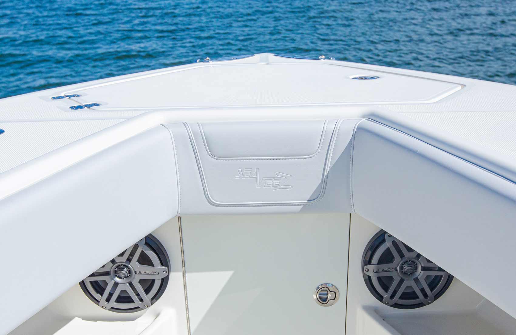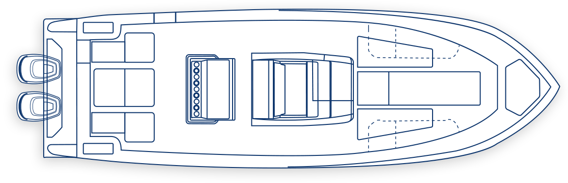 The SeaVee 322z represents a new approach to deck layout and ergonomics by placing the bait wells in the corners and extending the rear cockpit as well as adding storage capacity. Notable options include up to 4 live wells, an upper station with full controls, and a range of leaning post and t-top designs. Upgrading with Luxury Edition options (LE) adds molded-in forward seating or a variety of removable rear benches.
