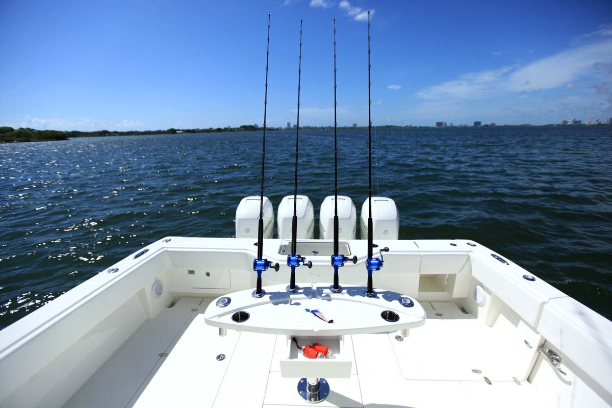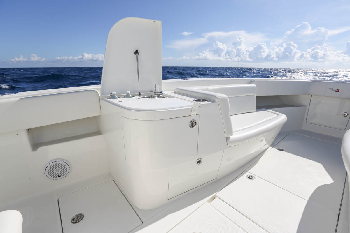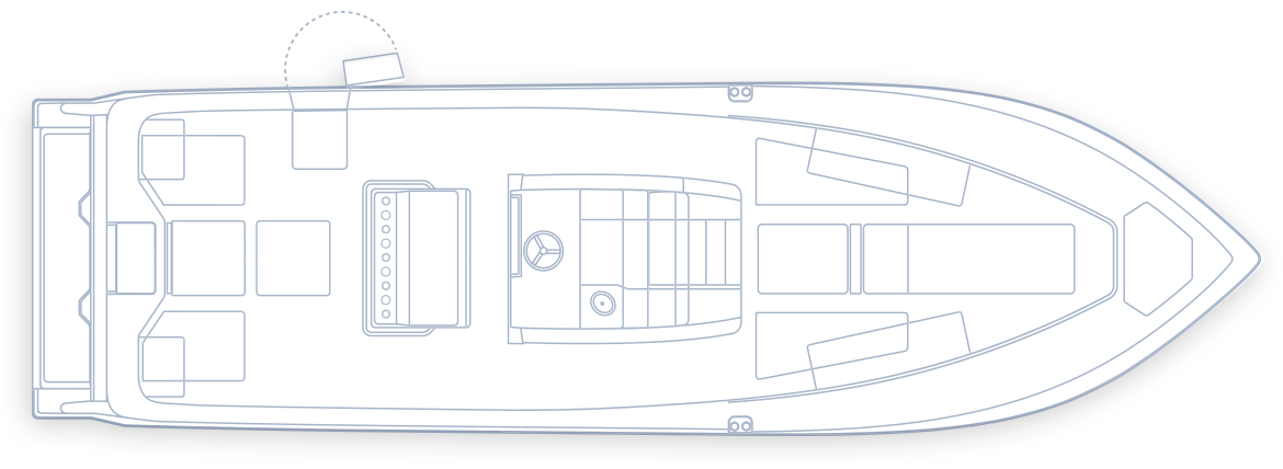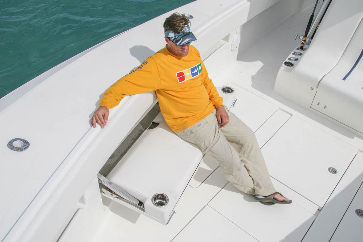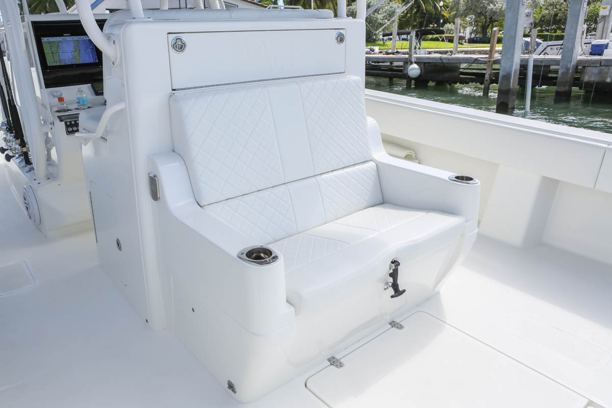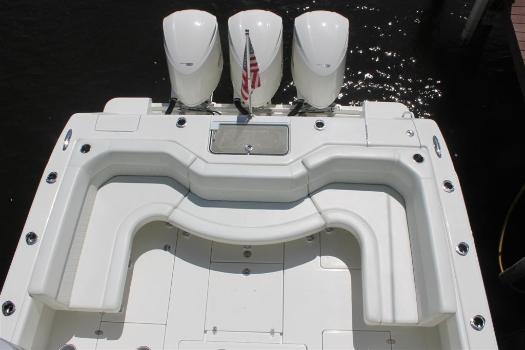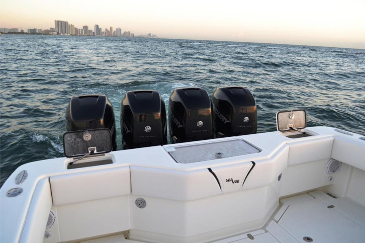 The SeaVee 390 can be the ultimate tournament fishing machine or a luxury island hopper, depending on the owner’s spec. Power packages include twin, triple or quad outboards up to 1,800 hp for maximum performance. Popular options include a variety of towers with full controls, up to 3 insulated fish boxes with a combined 370 gallons of capacity, plus an optional coffin box and up to 5 live wells capable of holding 220 gallons. Upgrade with Luxury Edition (LE) seating options for molded in front sofas and sun loungers or removable rear bench seats for added comfort.