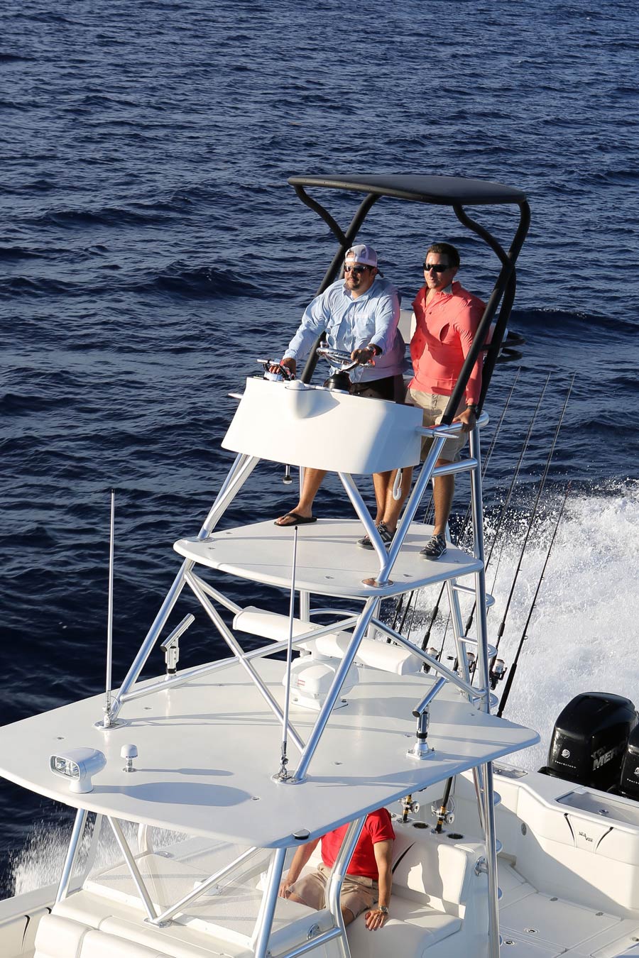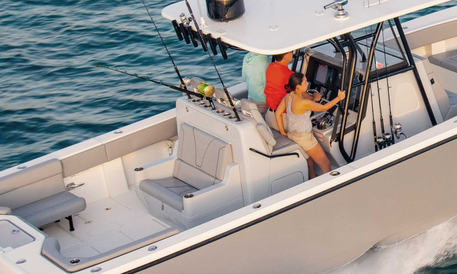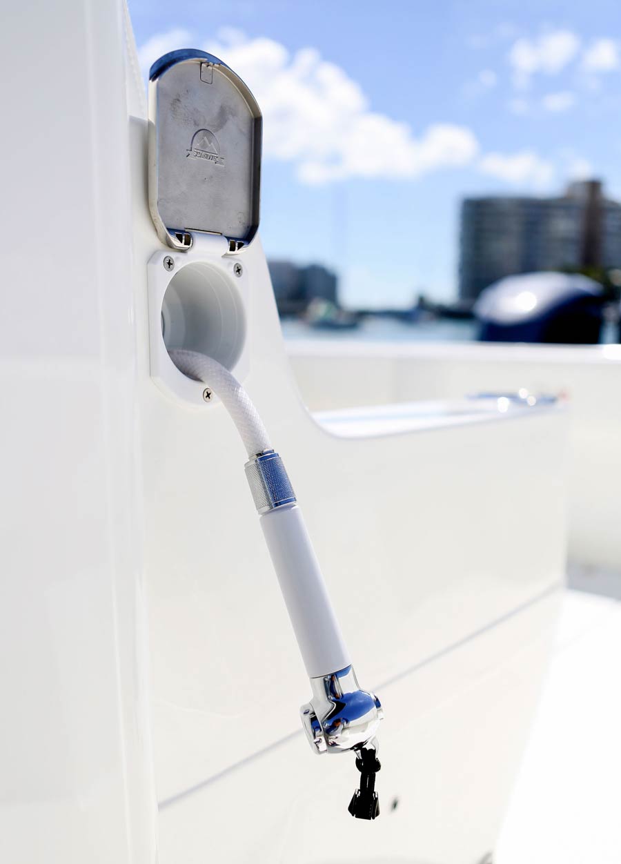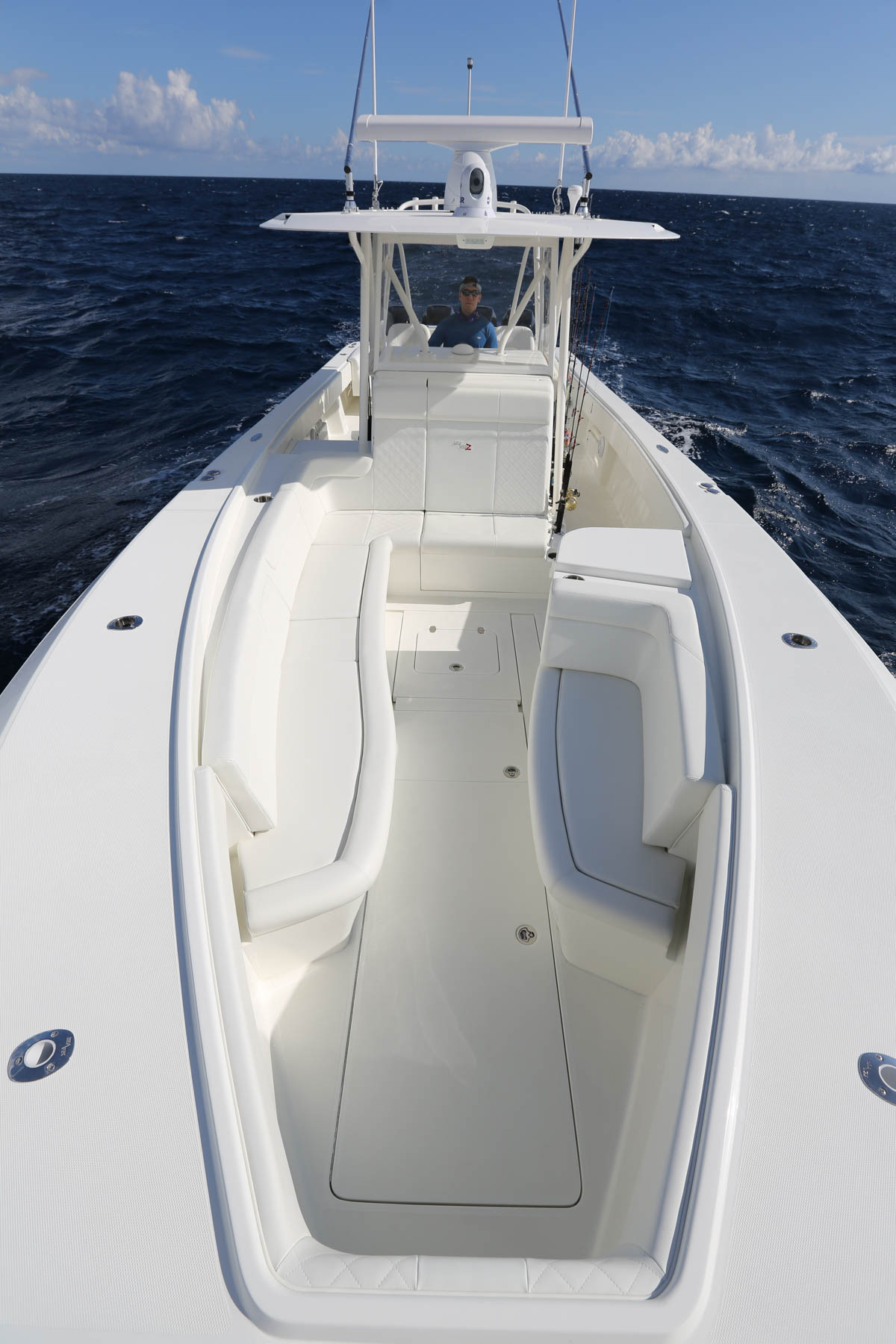 The SeaVee 390 can be the ultimate tournament fishing machine or a luxury island hopper, depending on the owner’s spec. Power packages include twin, triple or quad outboards up to 1,800 hp for maximum performance. Popular options include a variety of towers with full controls, up to 3 insulated fish boxes with a combined 370 gallons of capacity, plus an optional coffin box and up to 5 live wells capable of holding 220 gallons. Upgrade with Luxury Edition (LE) seating options for molded in front sofas and sun loungers or removable rear bench seats for added comfort.