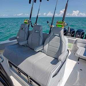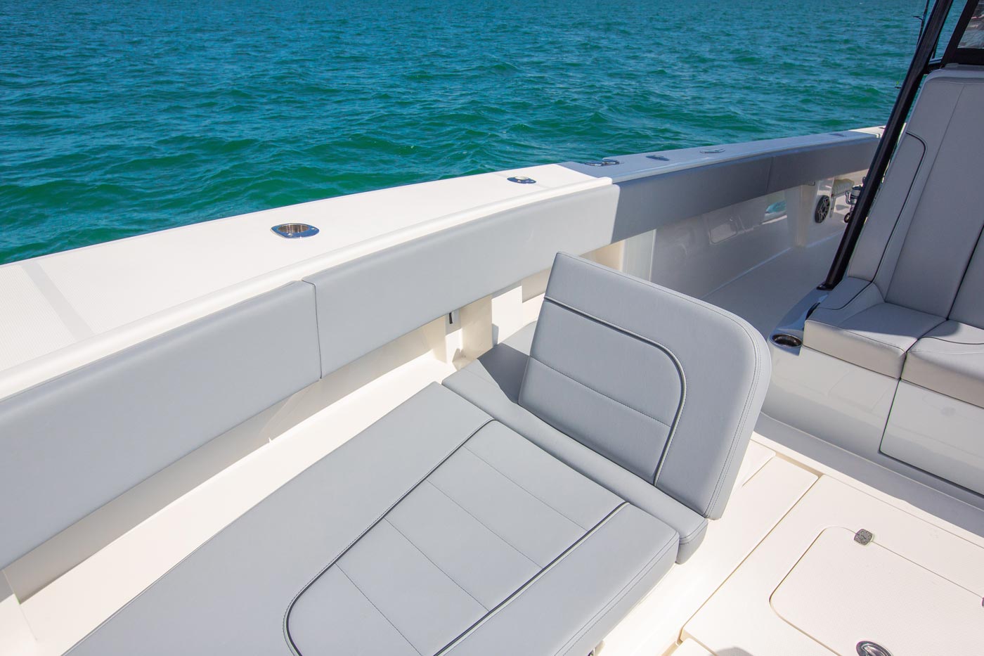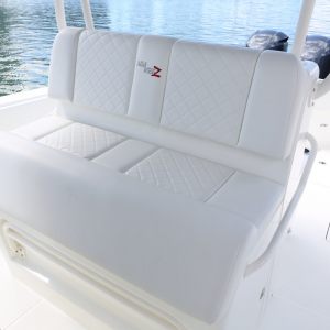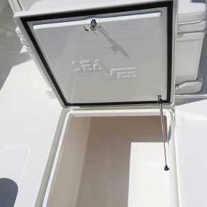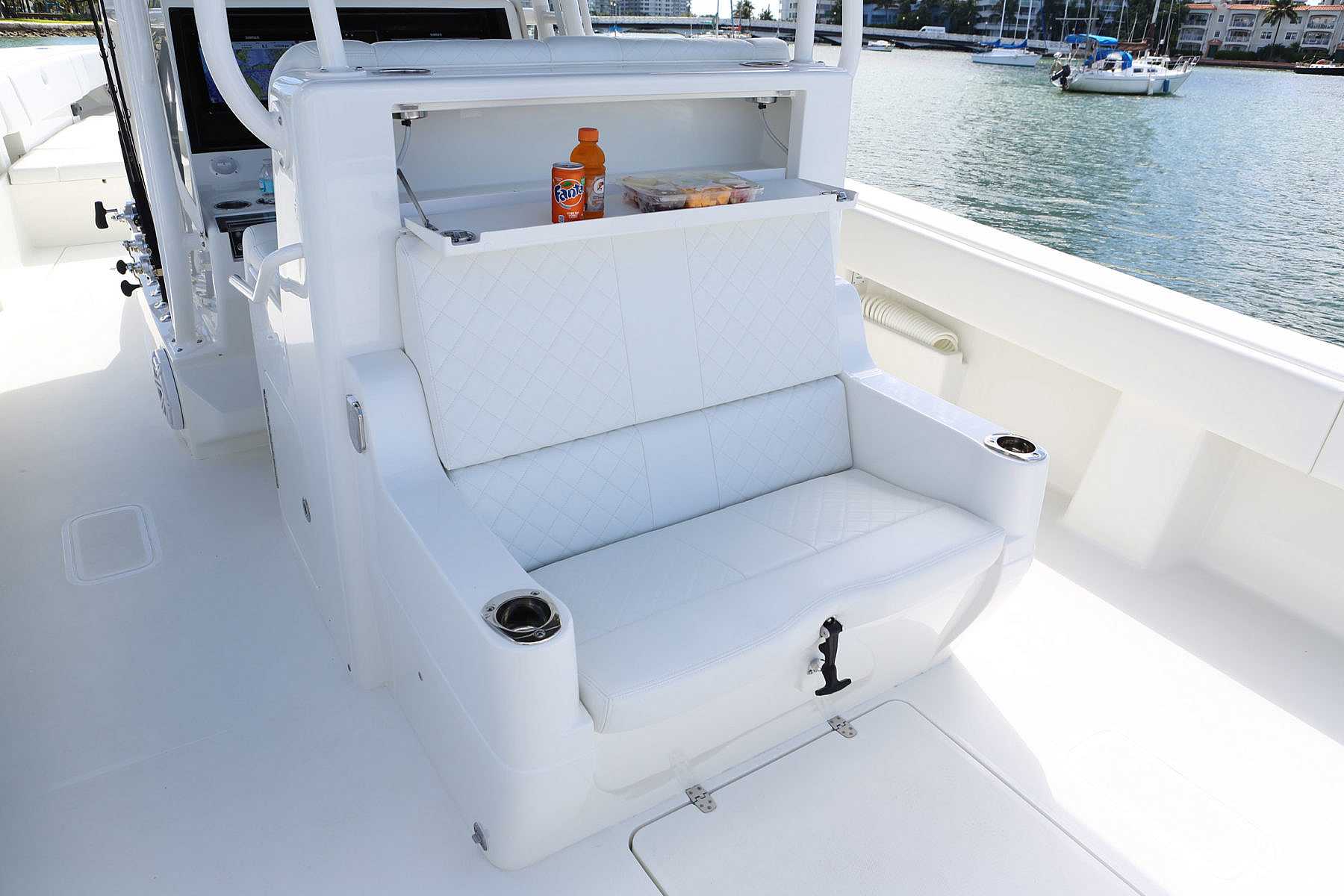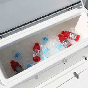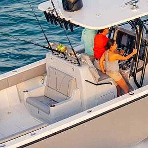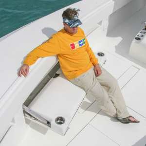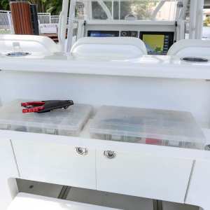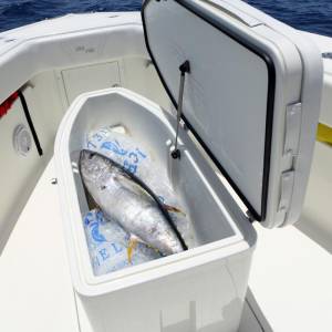 A 65 gallon bait well is integrated into the transom with an optional 140 gallon well available in the cockpit floor. A third 70 gal. well can be added in the front cockpit sole for maximum capacity. An optional fiberglass cooler slides out from below the tackle station leaning post on stainless tracks to create a rear-facing seat to make keeping an eye on the spread more comfortable.