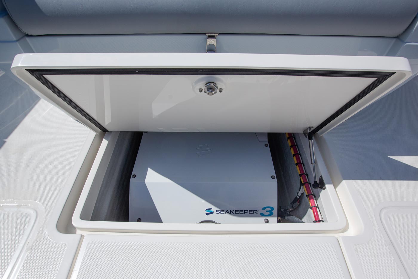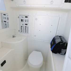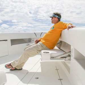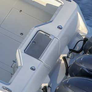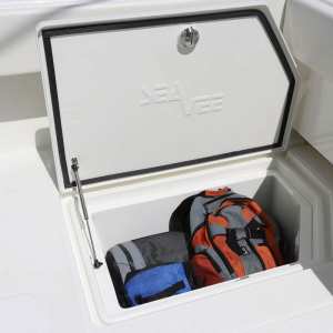 The console door is located on the front, allowing the sides of the console to be used for out-of-the-way rod storage. The interior houses battery switches, a breaker panel, a sink, access to electronics and batteries, and it can be outfitted with an optional marine head.