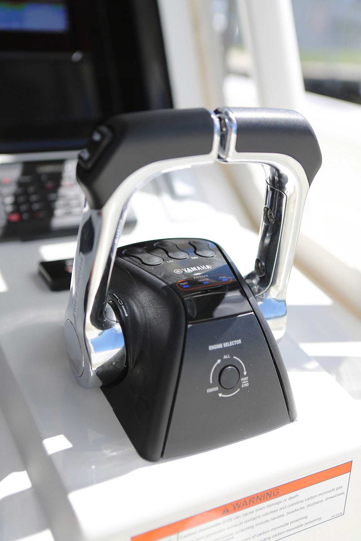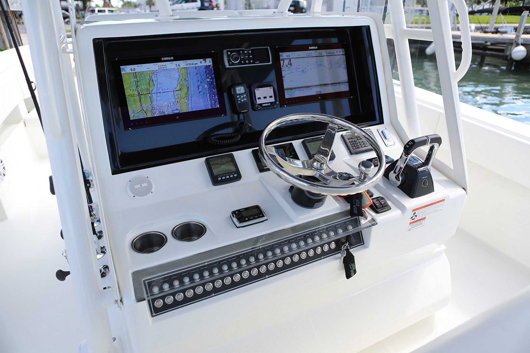 The 390z features a large console designed to maximize deck space, while providing plenty of room on the inside. The console’s ergonomic design accommodates two 16″ navigation units side by side with space between them for a VHF and a head unit, or choose 19″ displays for a glass bridge look. A splash cover protects vital electronics. And an array of switches that controls onboard accessories is within easy reach.