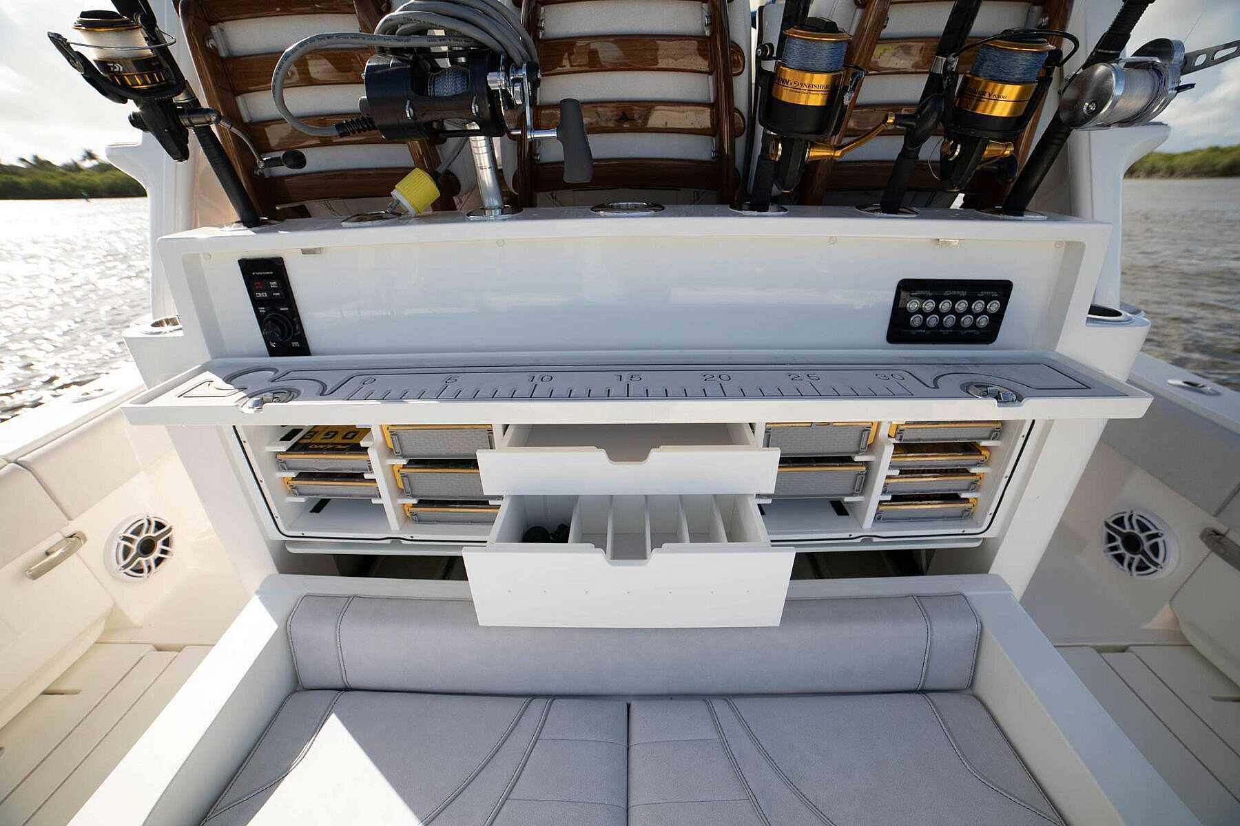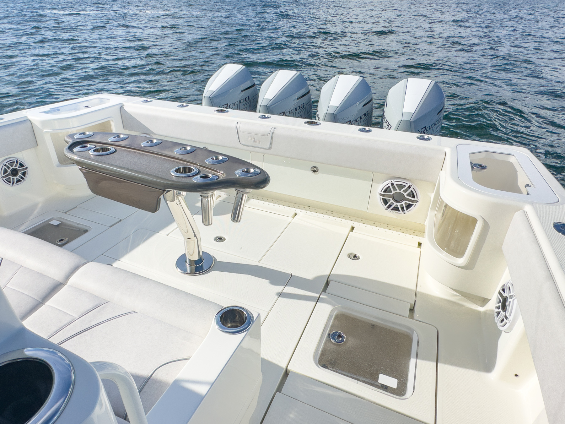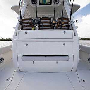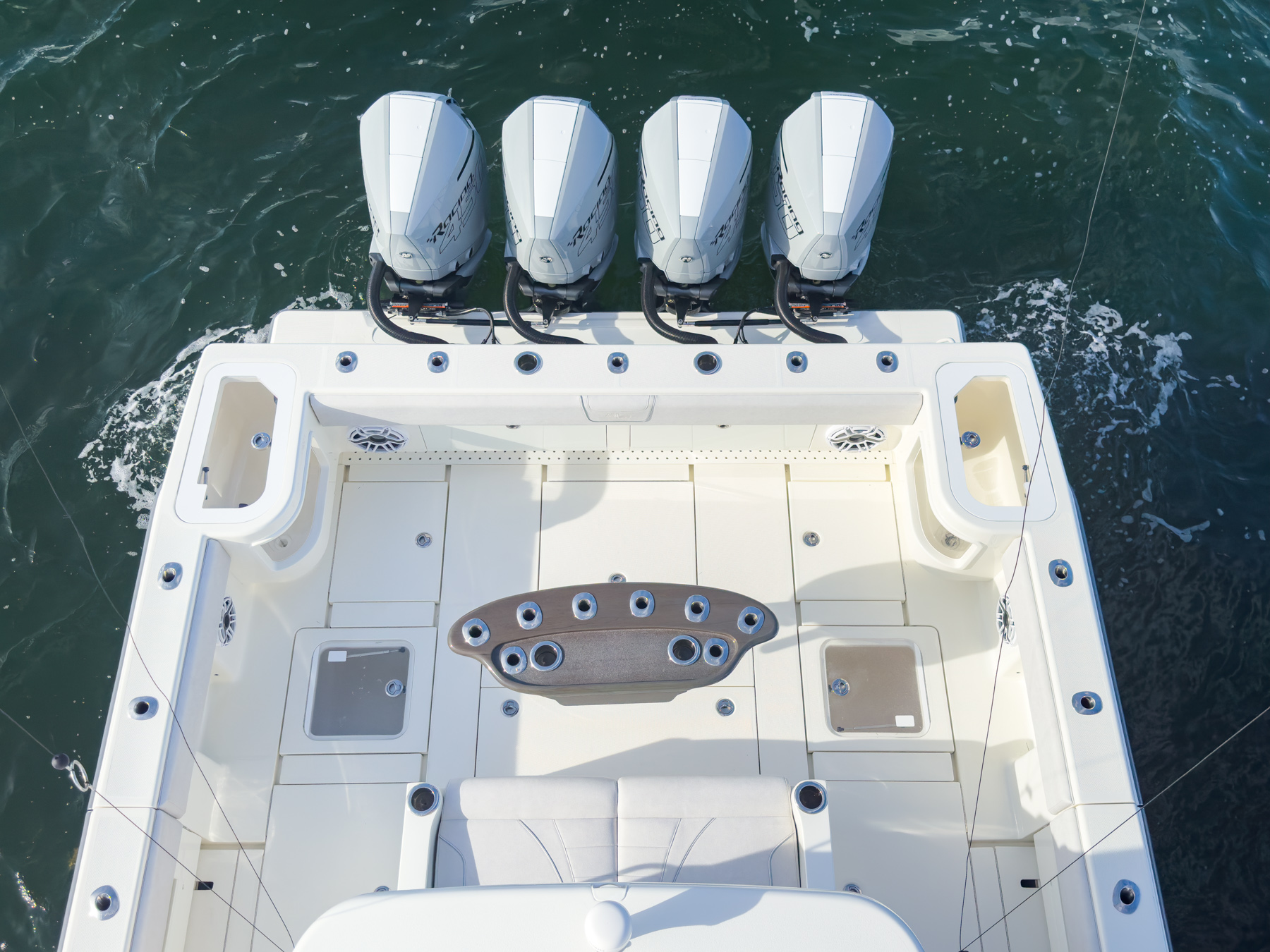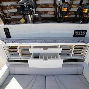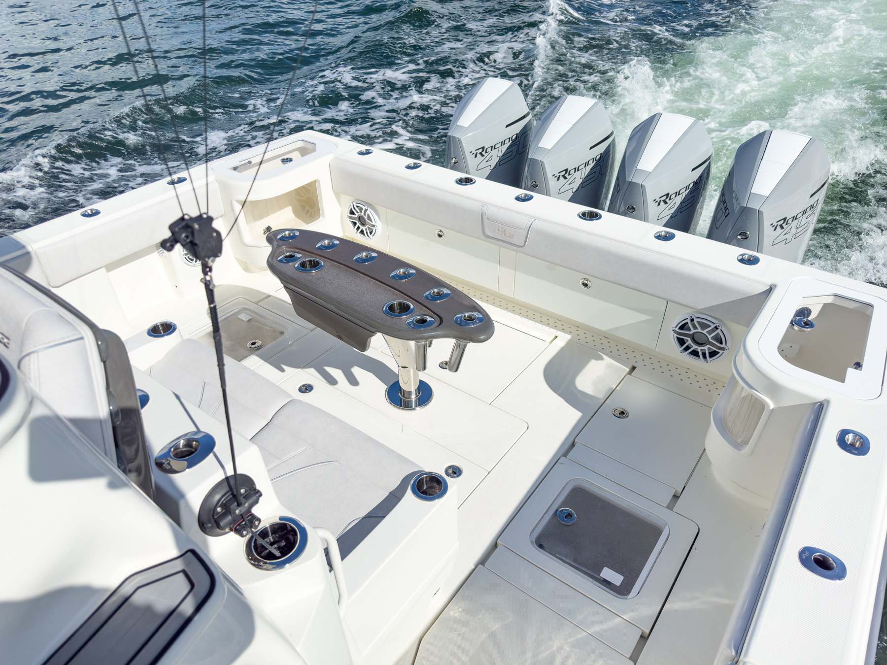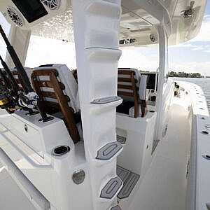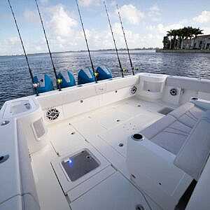 The 450z can carry an almost limitless amount of bait and rigged rods. There are twin 40 gallon bait wells integrated into both sides of the transom, along with two optional 40 gallon wells available in the cockpit floor. A fifth 60 gal. well can be added in the front cockpit sole. Rods can be stored along either side of the front lounger, in the leaning post (or 2nd row seat arrangement), tower, below deck and stacked two deep along the transom.