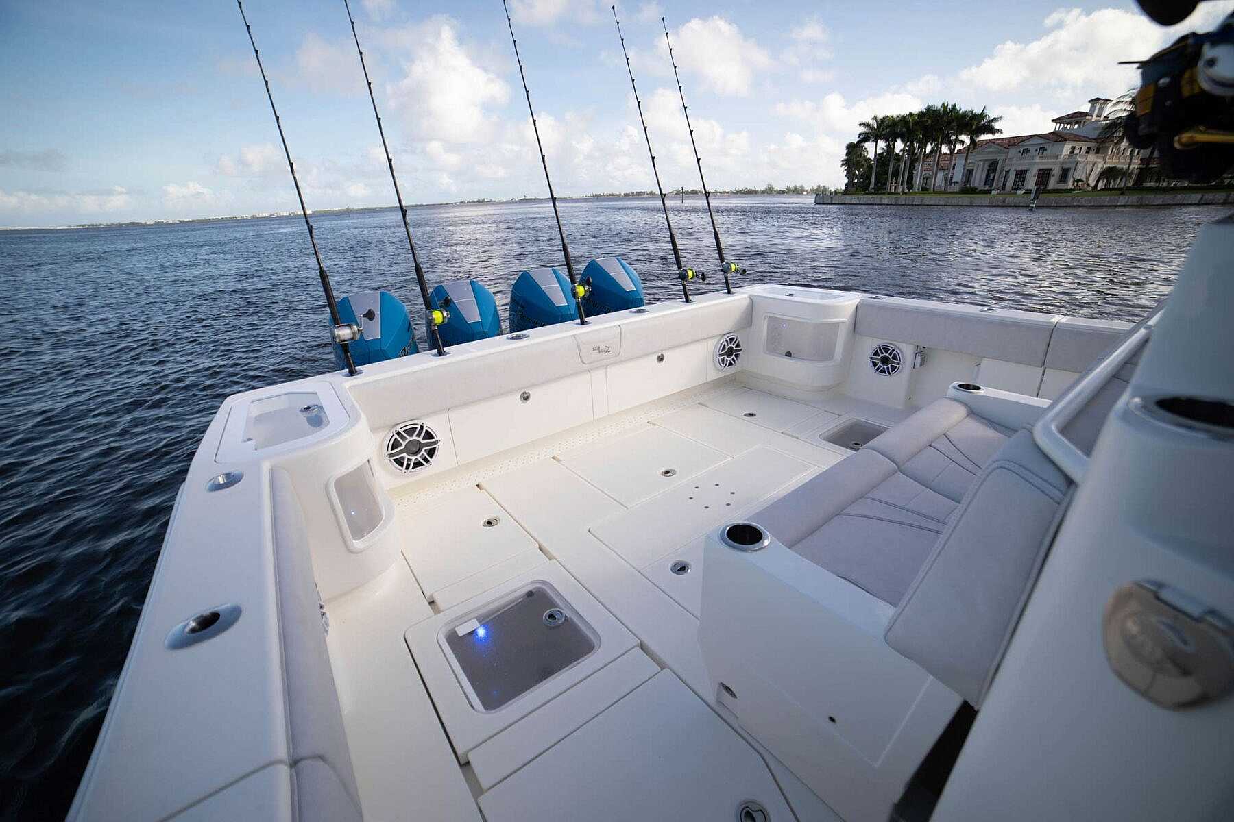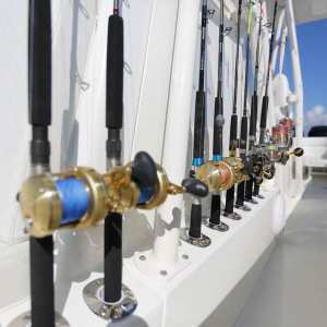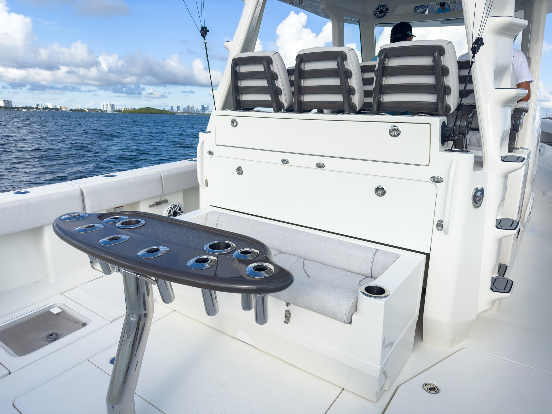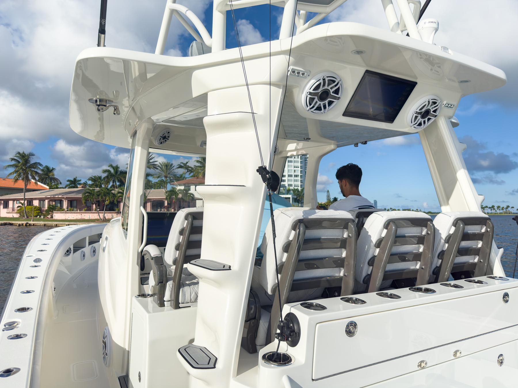 The 450z can carry an almost limitless amount of bait and rigged rods. There are twin 40 gallon bait wells integrated into both sides of the transom, along with two optional 40 gallon wells available in the cockpit floor. A fifth 60 gal. well can be added in the front cockpit sole. Rods can be stored along either side of the front lounger, in the leaning post (or 2nd row seat arrangement), tower, below deck and stacked two deep along the transom.