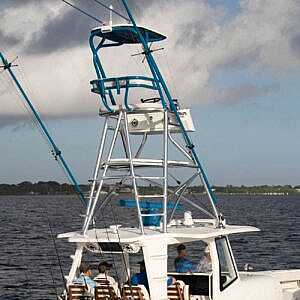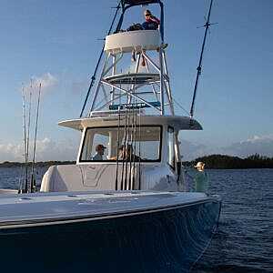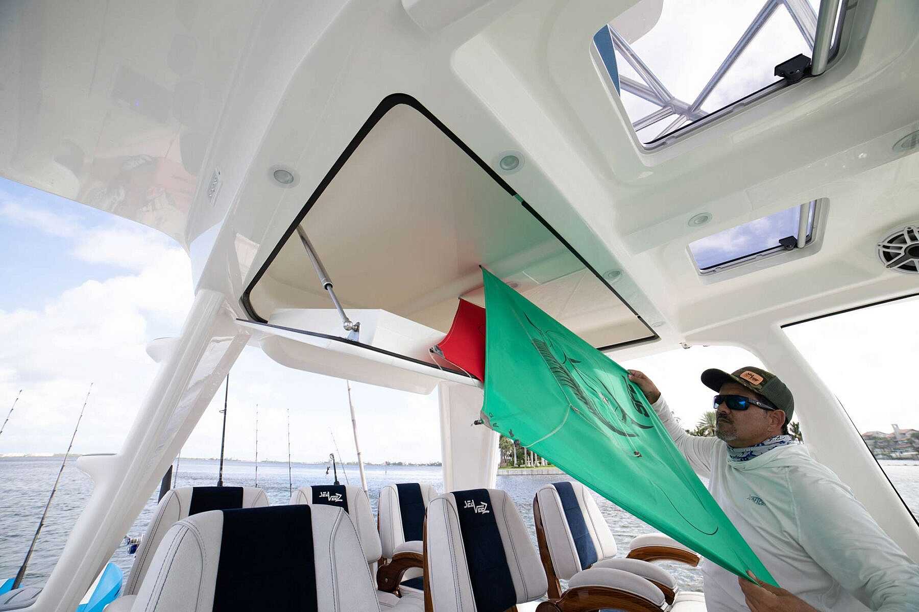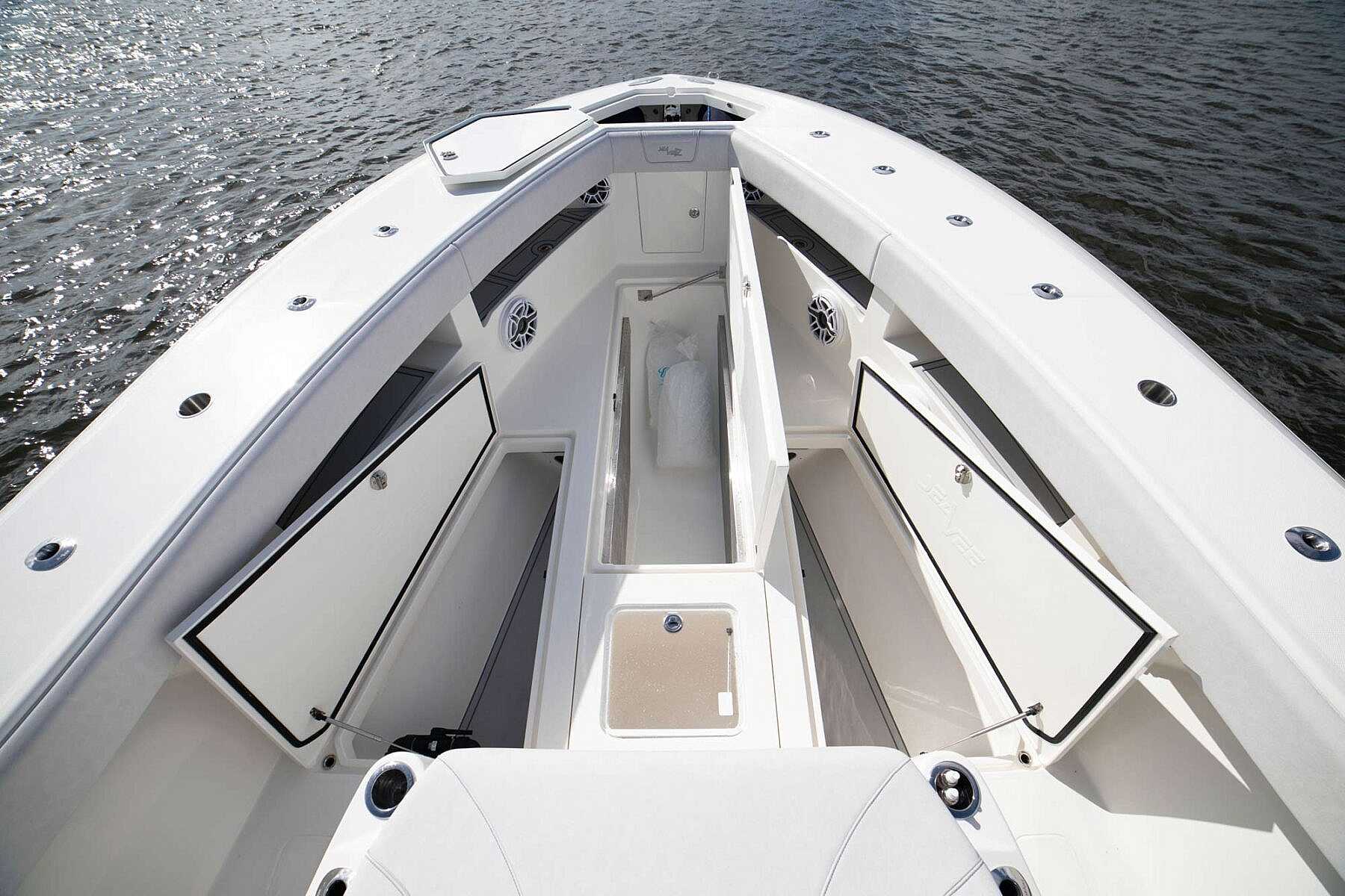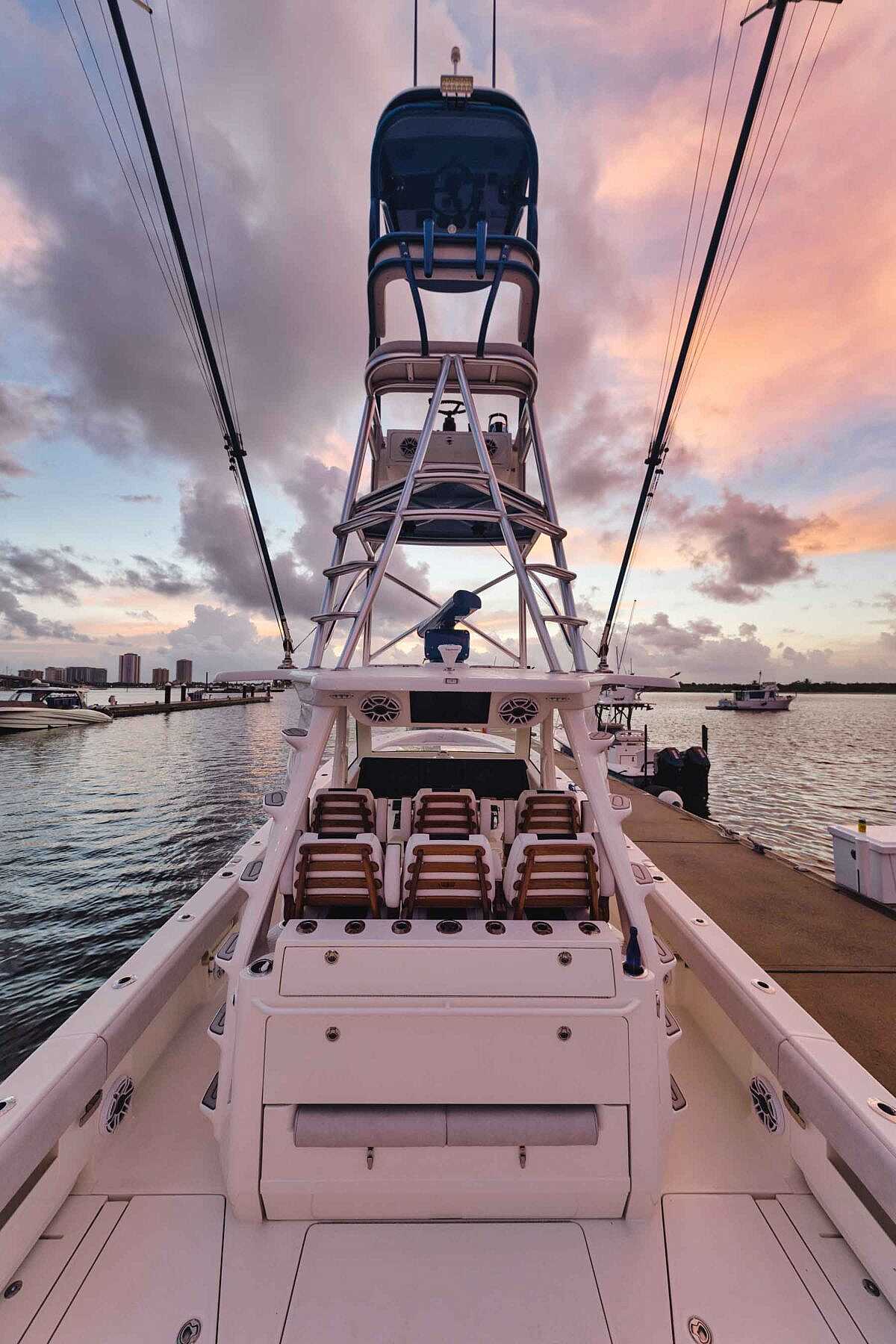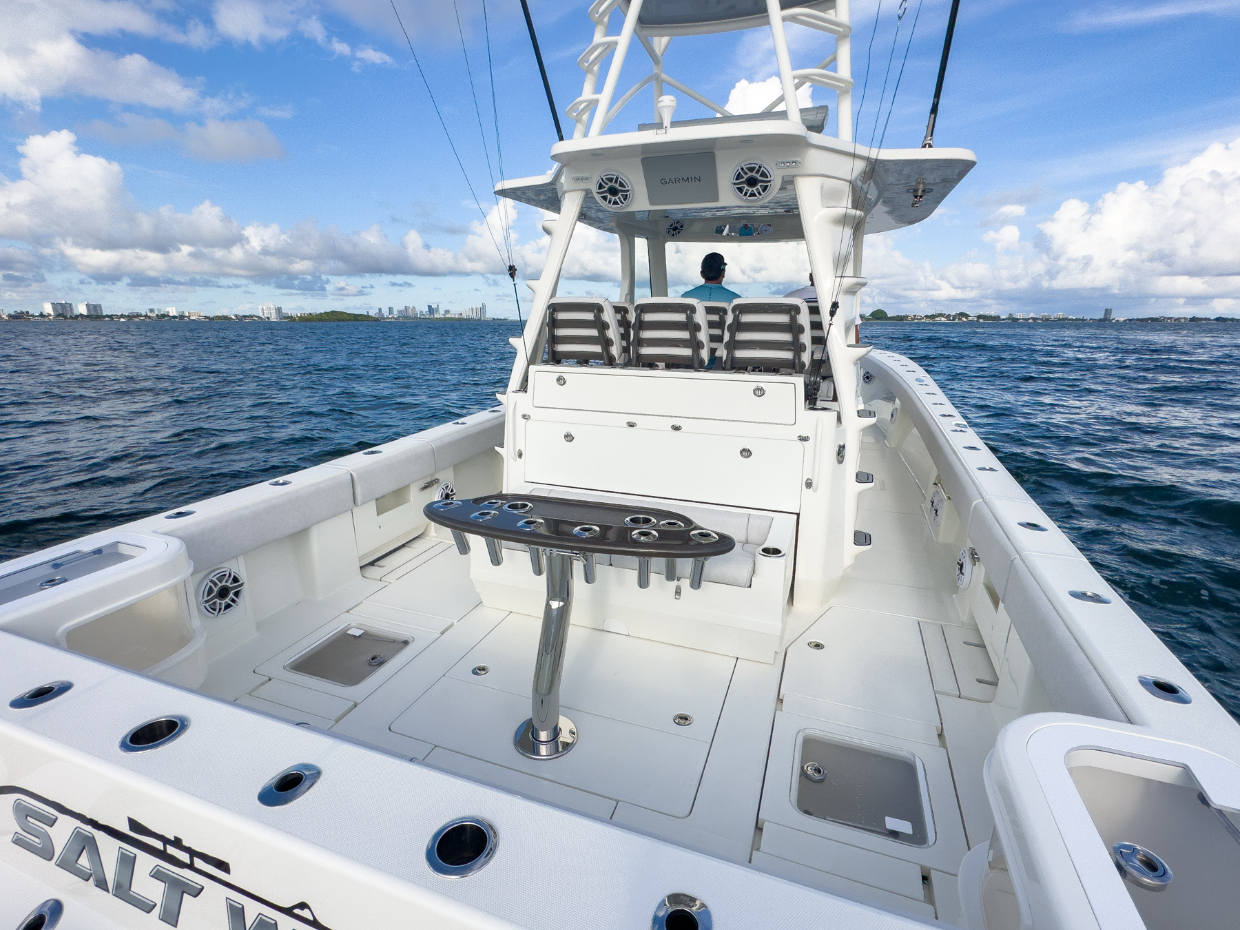 The 450z can carry an almost limitless amount of bait and rigged rods. There are twin 40 gallon bait wells integrated into both sides of the transom, along with two optional 40 gallon wells available in the cockpit floor. A fifth 60 gal. well can be added in the front cockpit sole. Rods can be stored along either side of the front lounger, in the leaning post (or 2nd row seat arrangement), tower, below deck and stacked two deep along the transom.