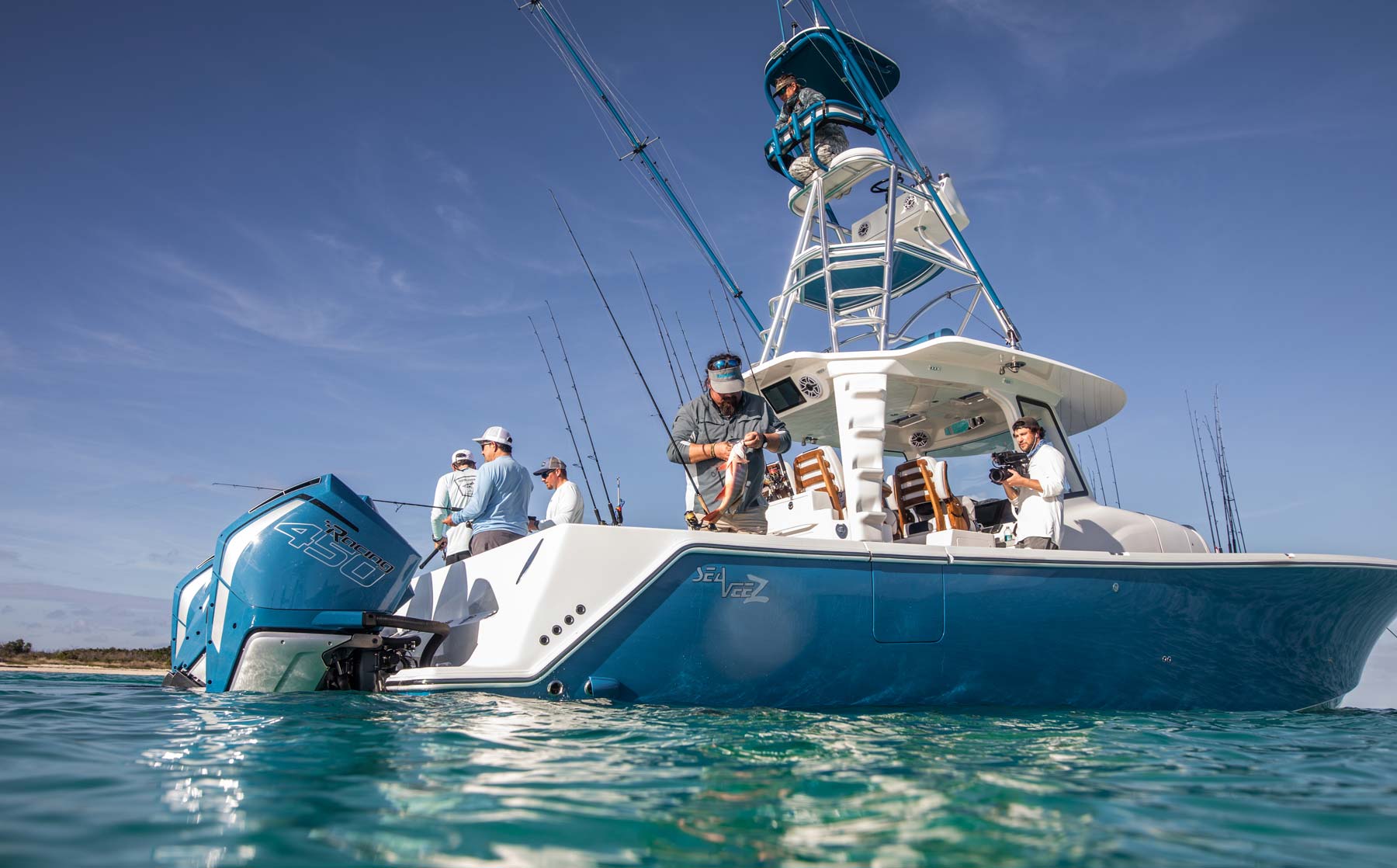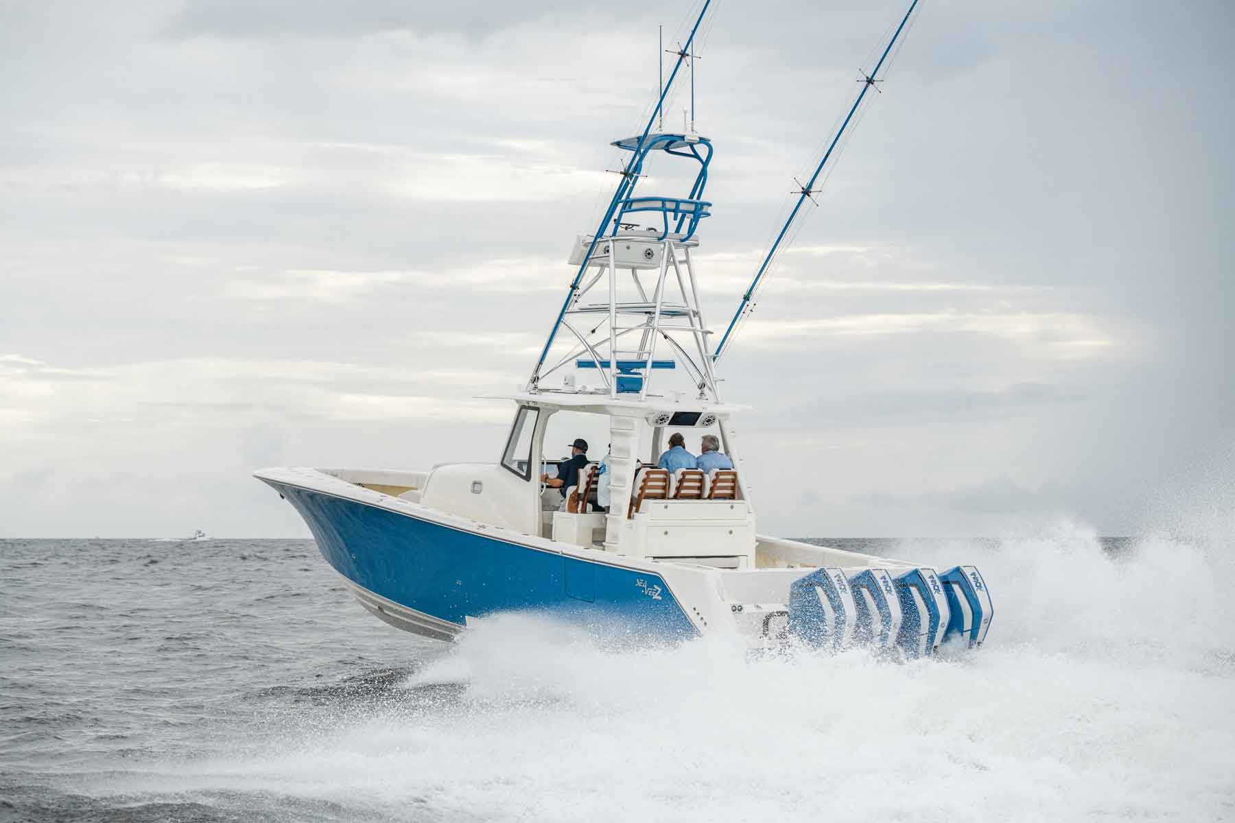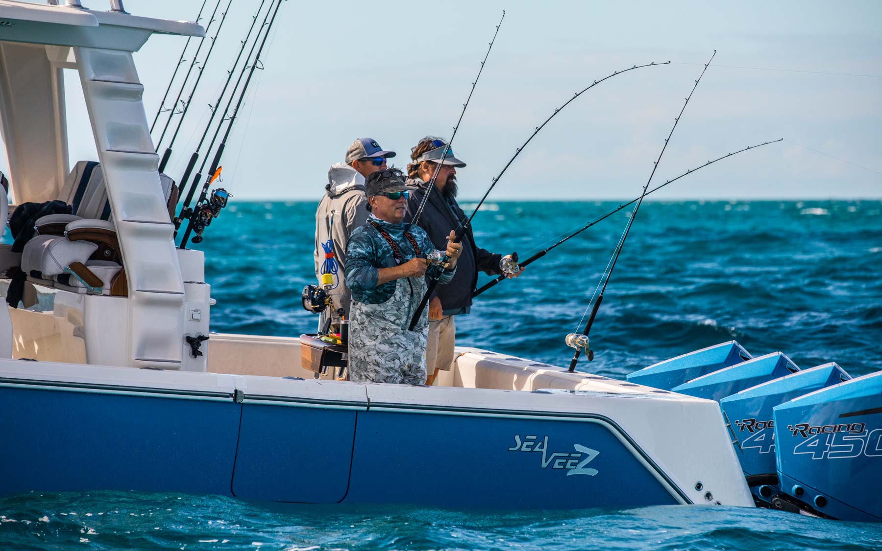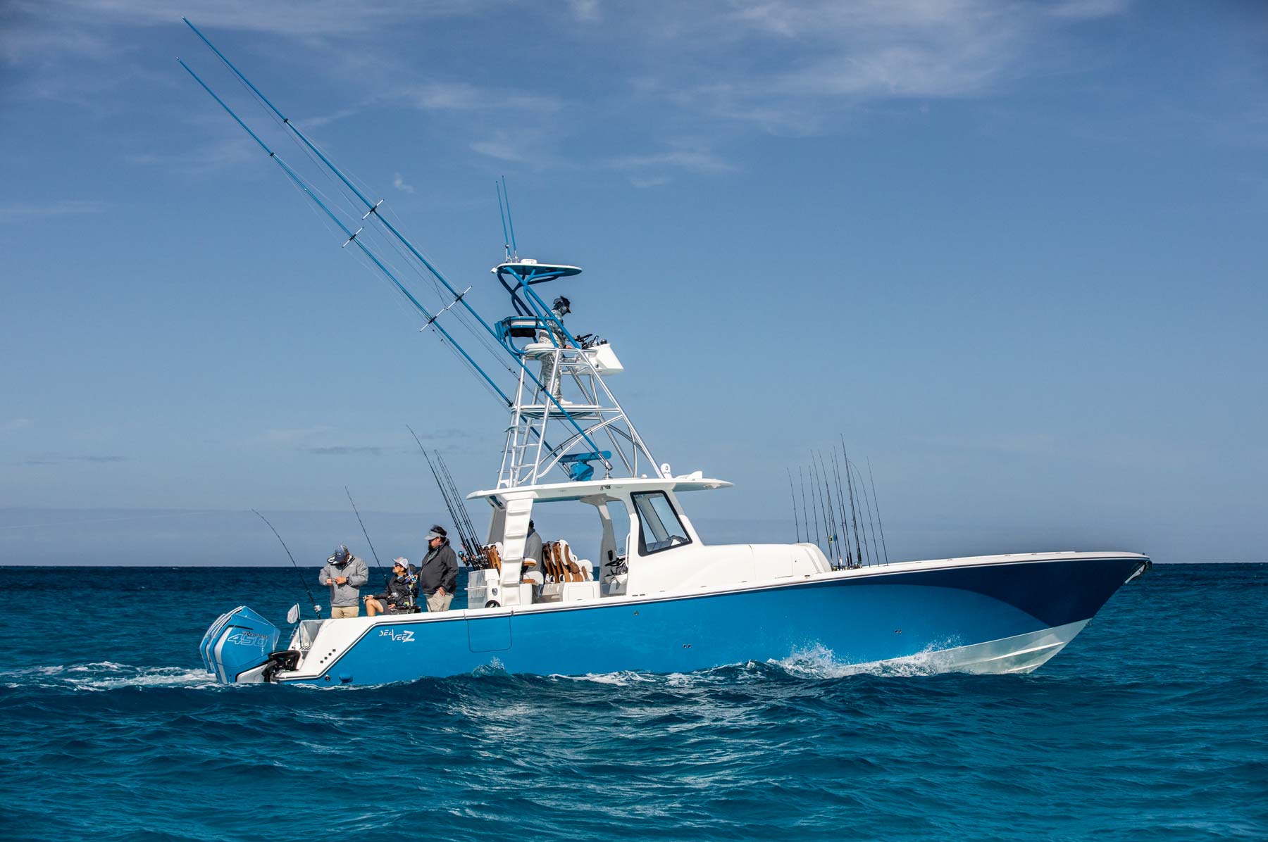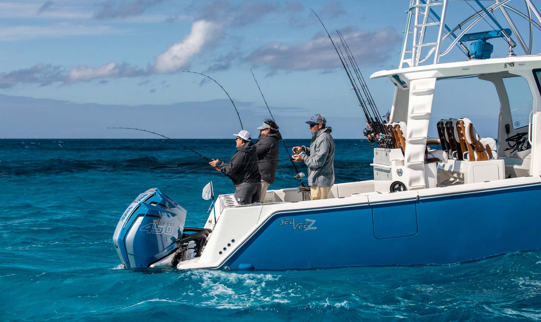 The SeaVee 450z is an unrivaled fishing platform offering the speed and versatility of a center console combined with the comfort, deck space, range and bait capacity of a sport fisherman. The new SeaVee flagship has the capabilities to explore what lies beyond the horizon while serving as a steady platform to help you catch tournament winning fish.