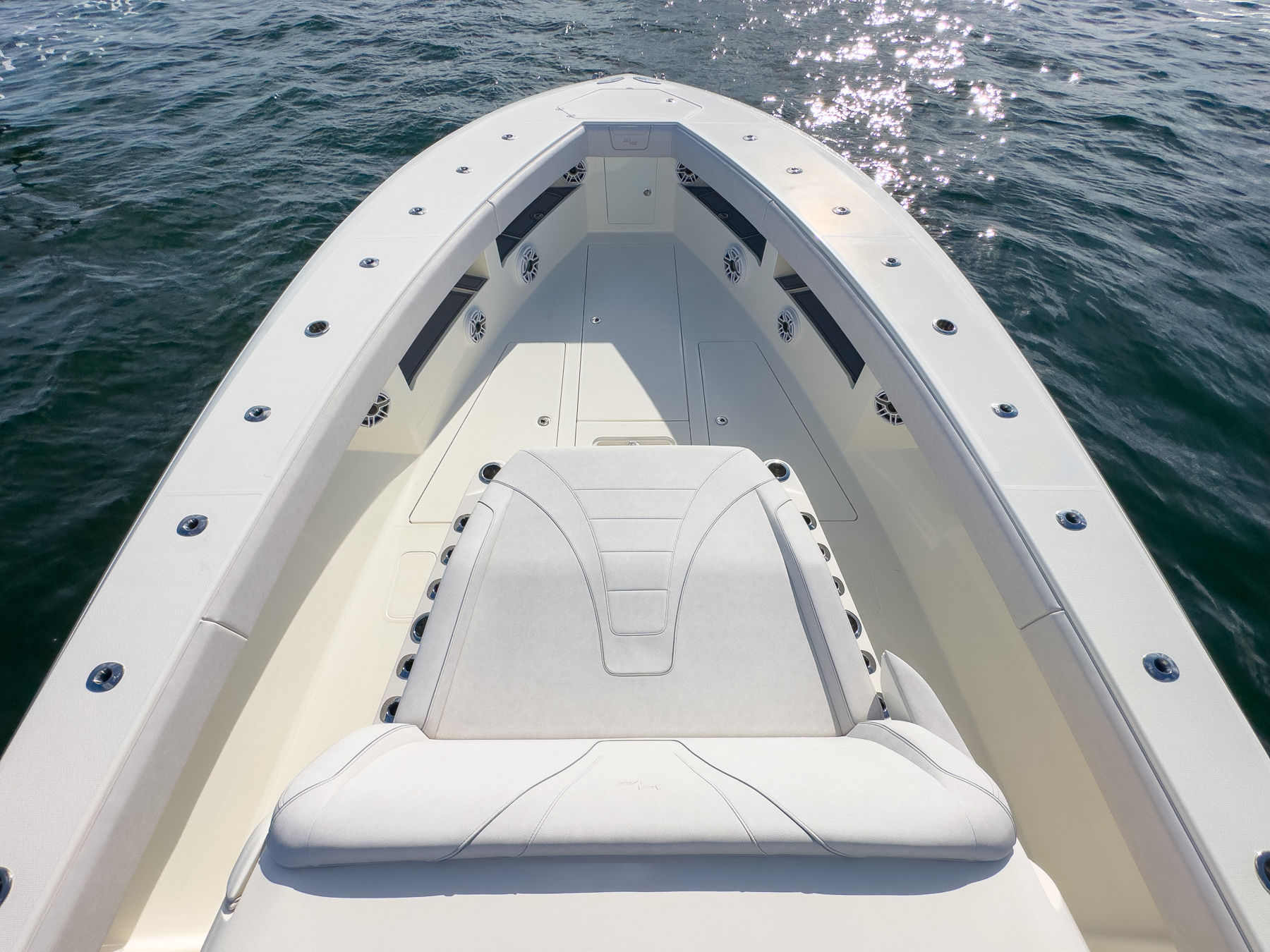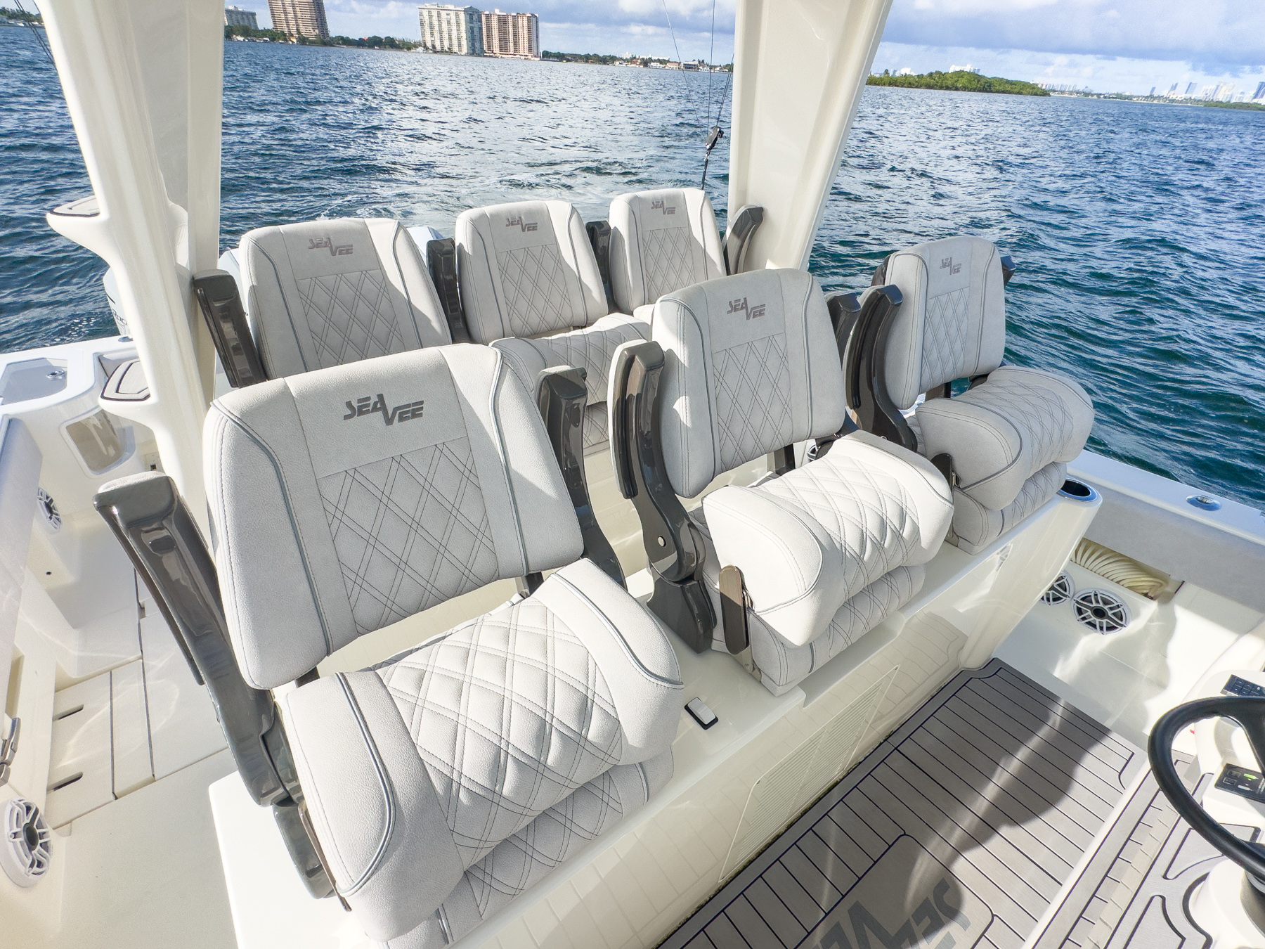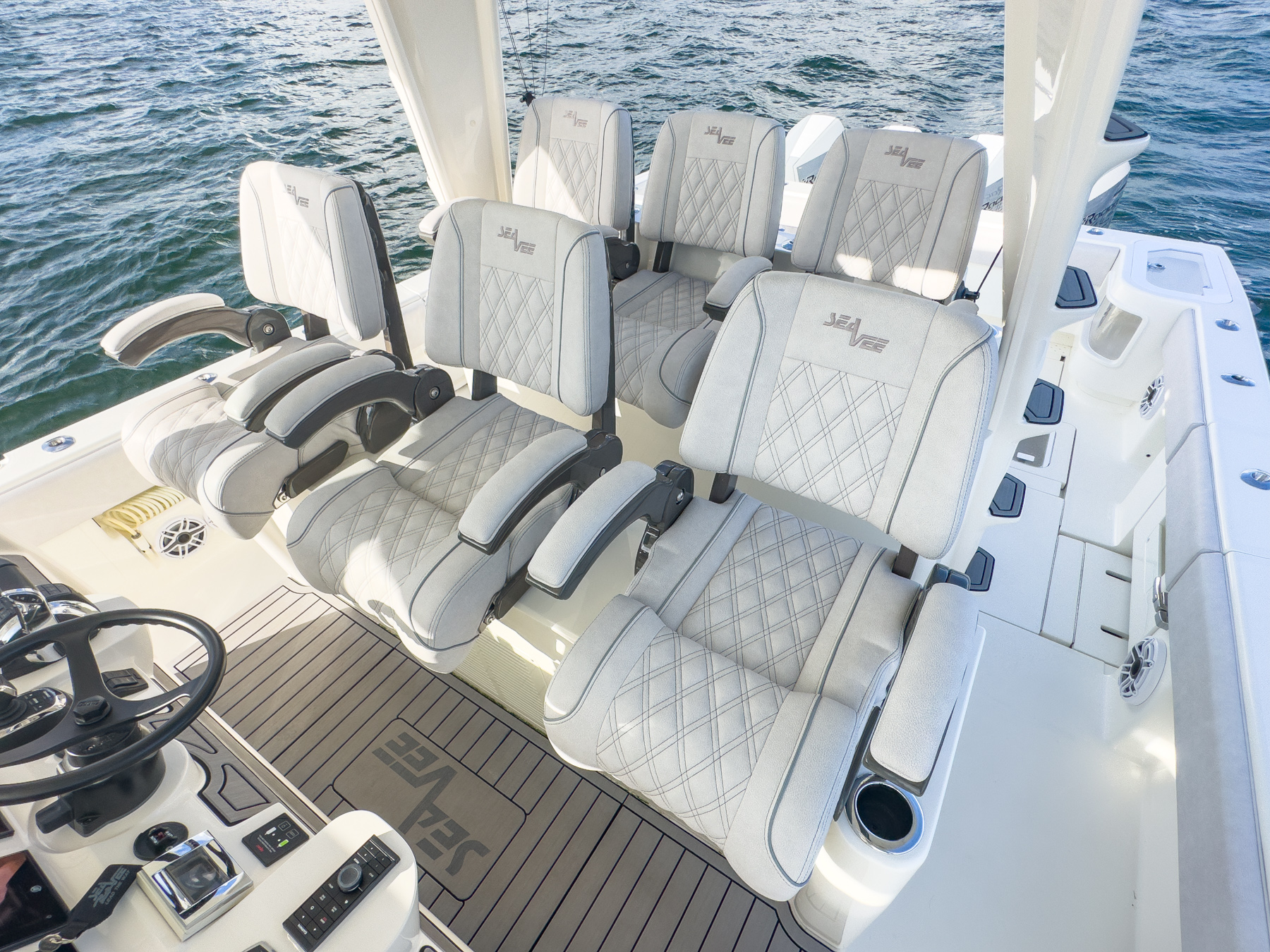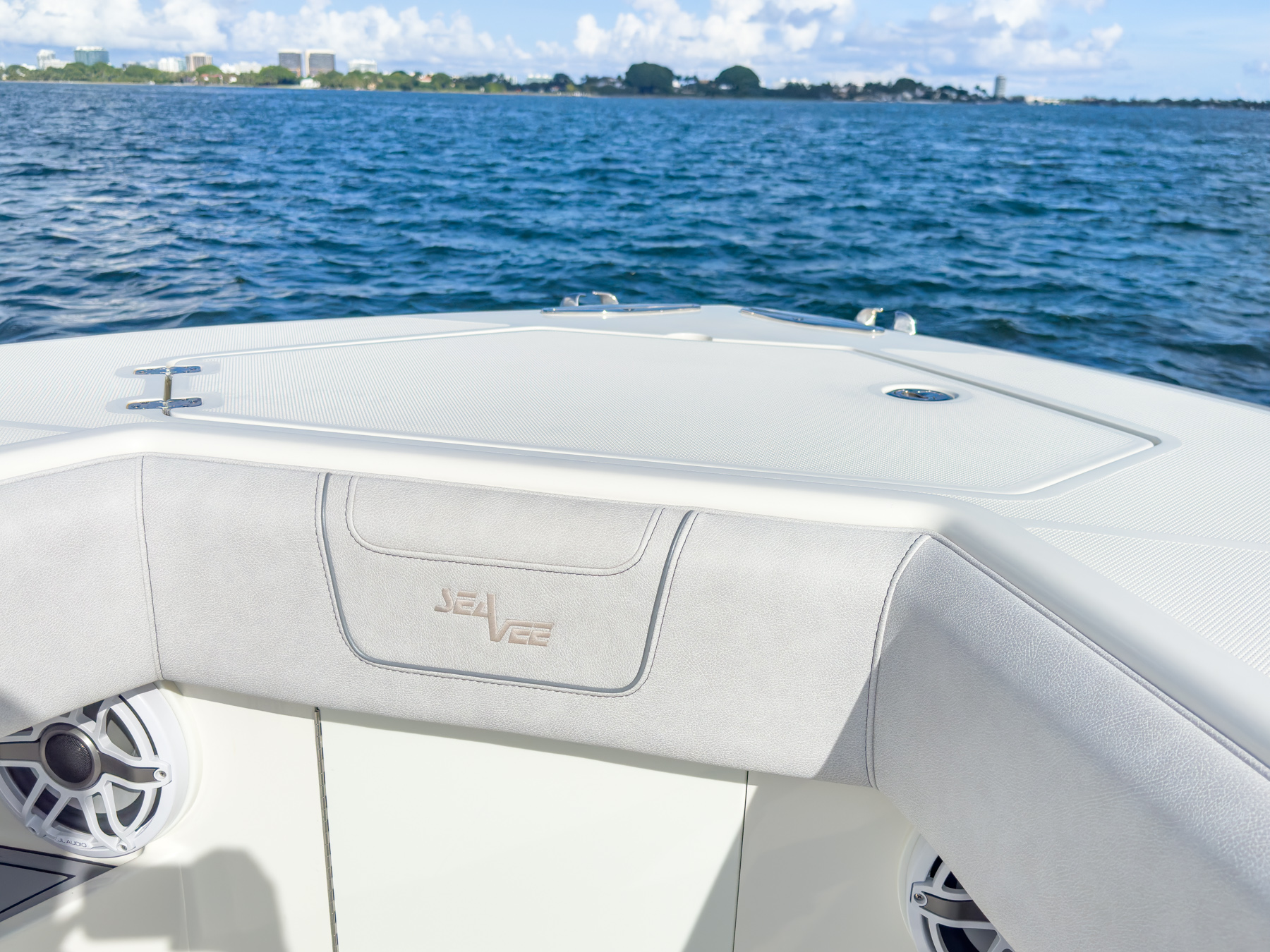 The 450z features SeaVee’s award winning twin stepped, cross-ventilated hull with patented SpeedRail® technology. Multiple lifting bodies with unique geometry ensure a fixed trim angle throughout a wide range of speeds. That’s a fancy way of saying you always have a clear view of the horizon, maximum fuel efficiency, more speed and safe predicable handling when making hard turns.