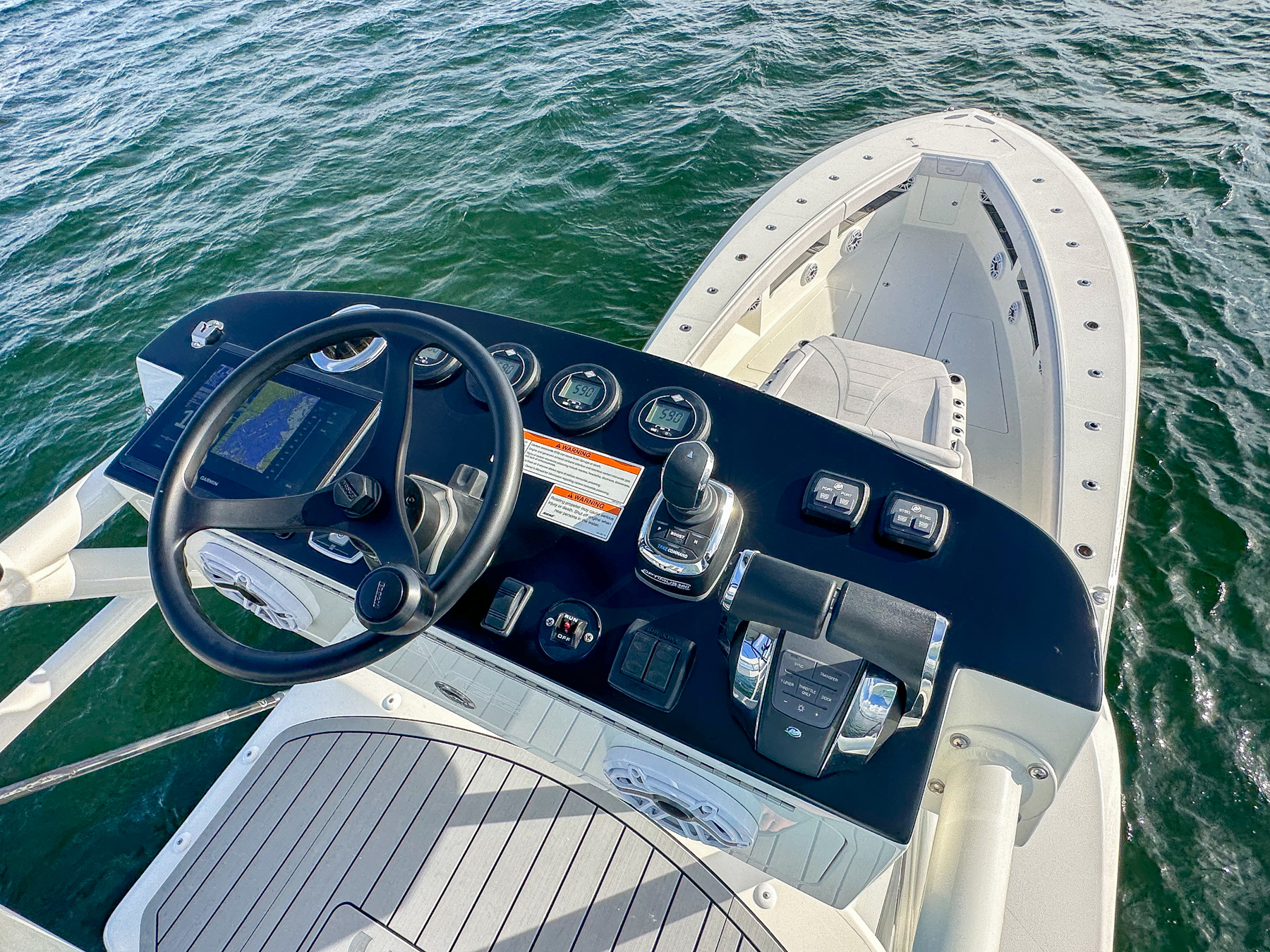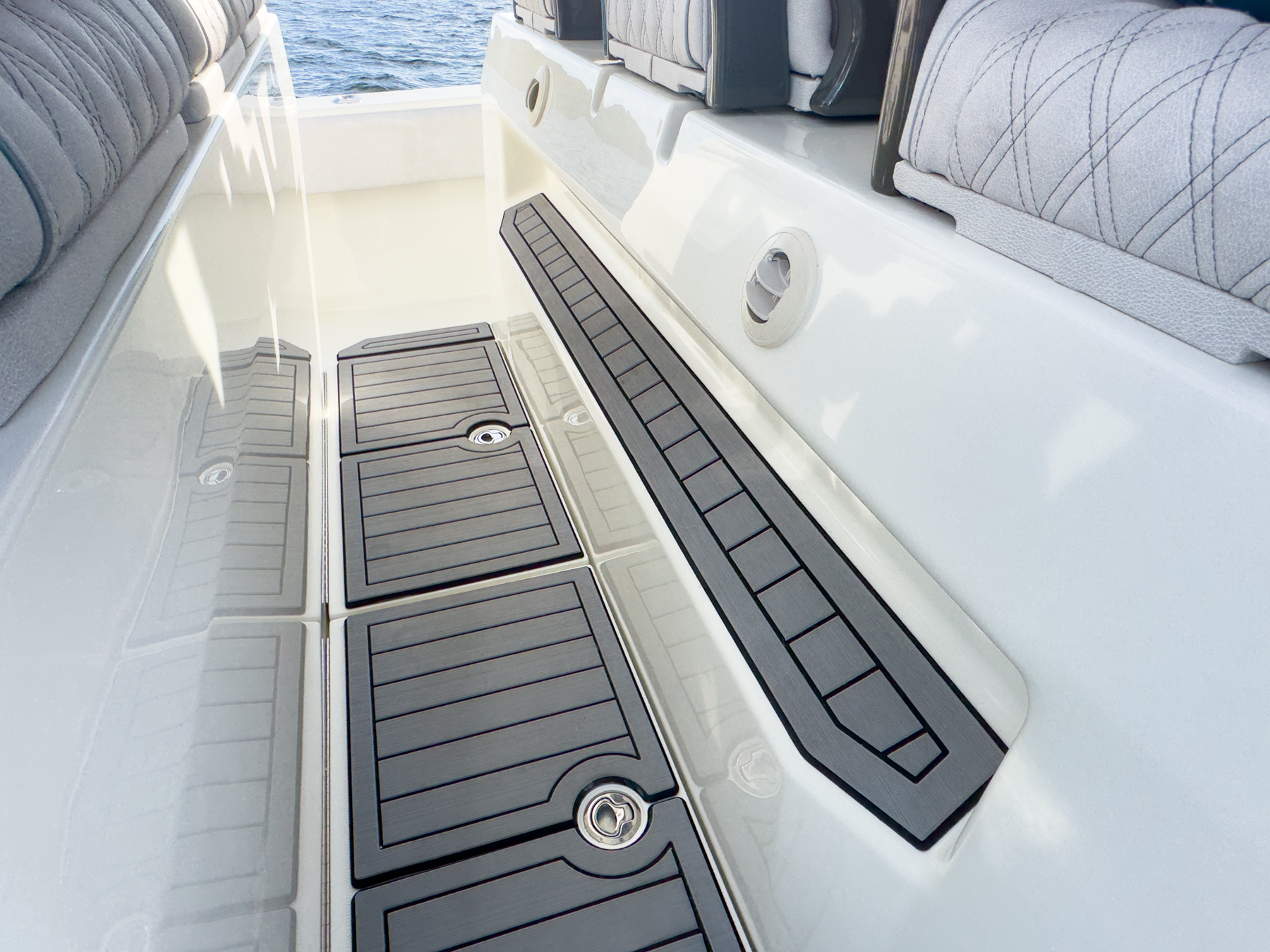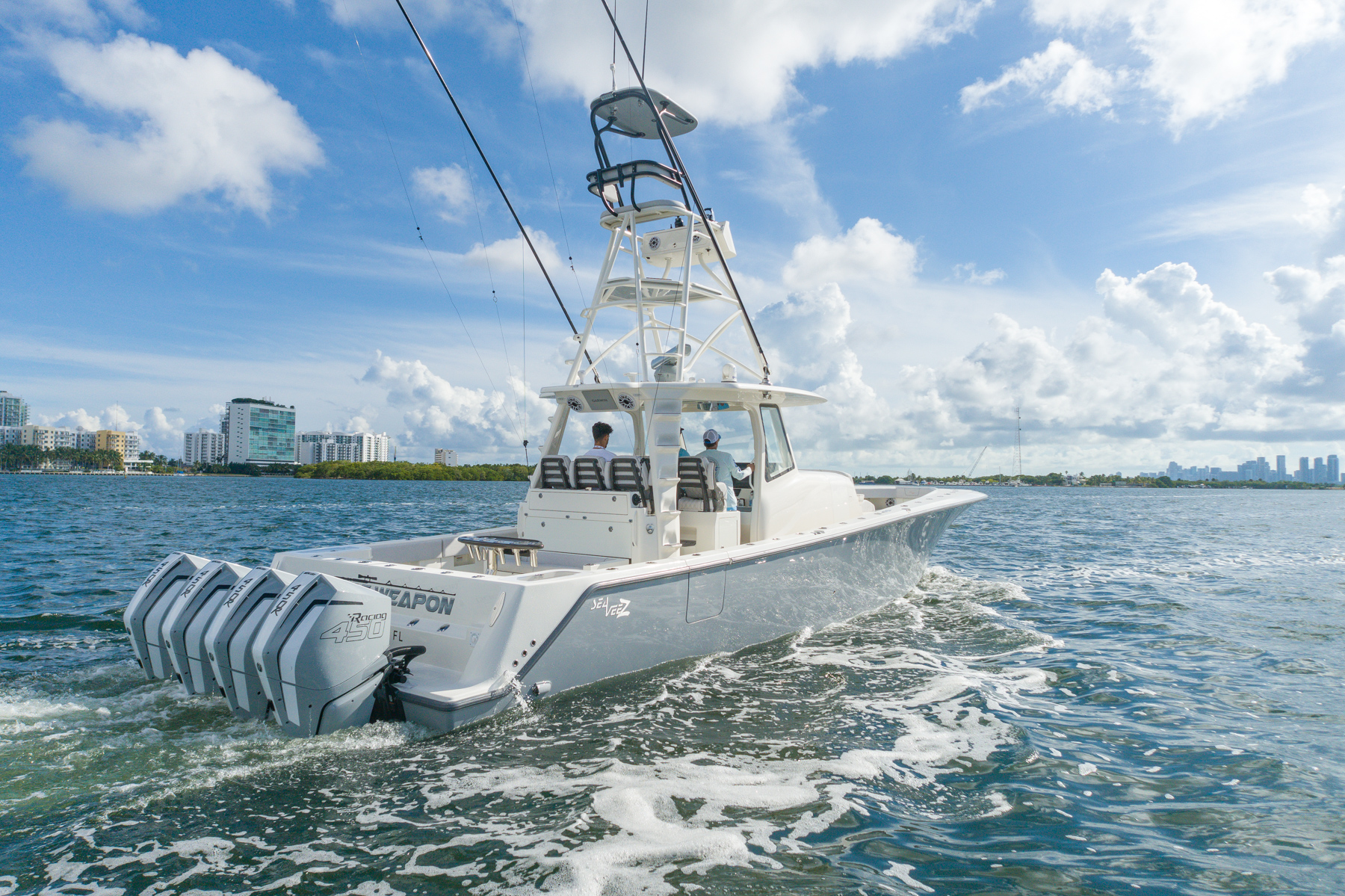 The 450z features SeaVee’s award winning twin stepped, cross-ventilated hull with patented SpeedRail® technology. Multiple lifting bodies with unique geometry ensure a fixed trim angle throughout a wide range of speeds. That’s a fancy way of saying you always have a clear view of the horizon, maximum fuel efficiency, more speed and safe predicable handling when making hard turns.