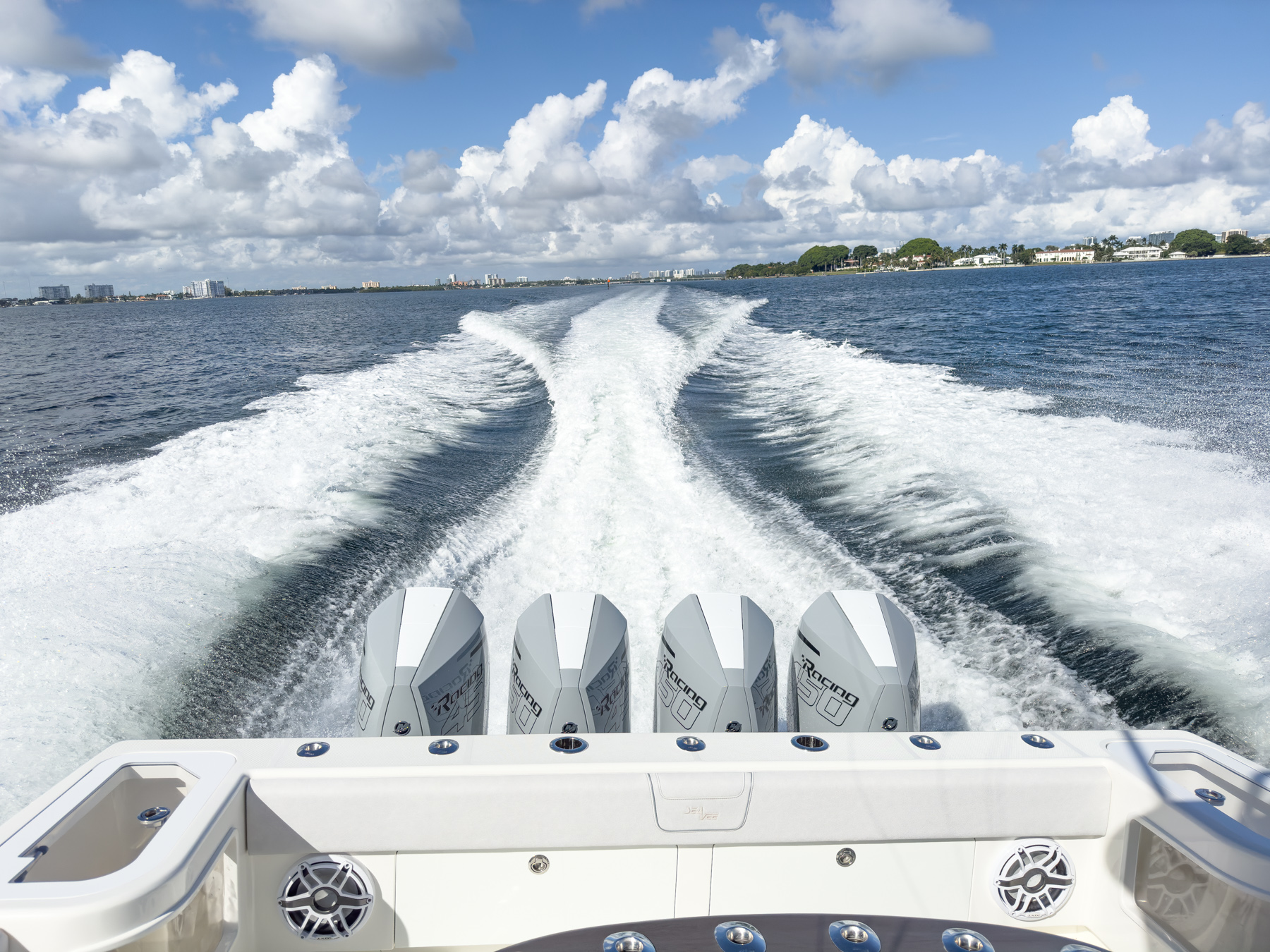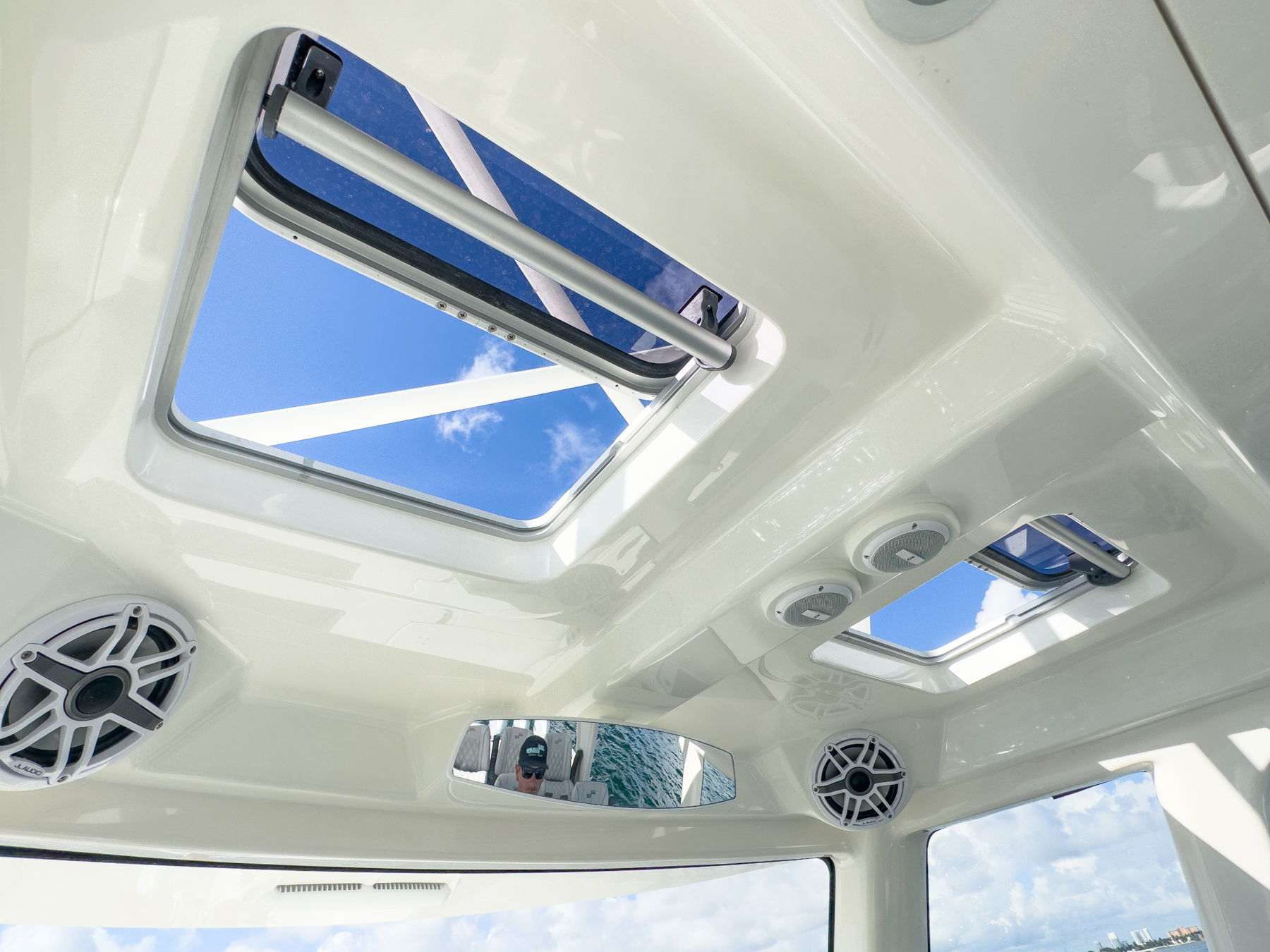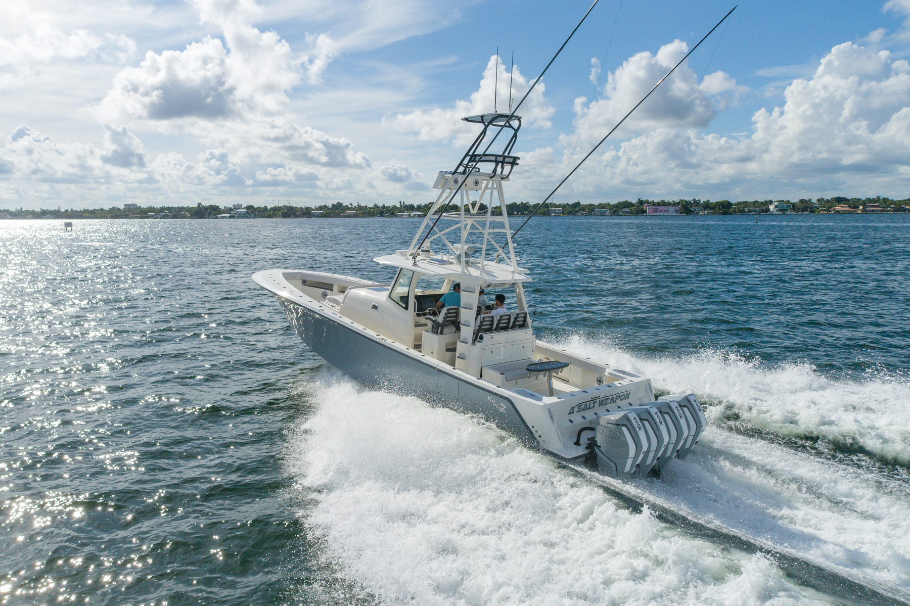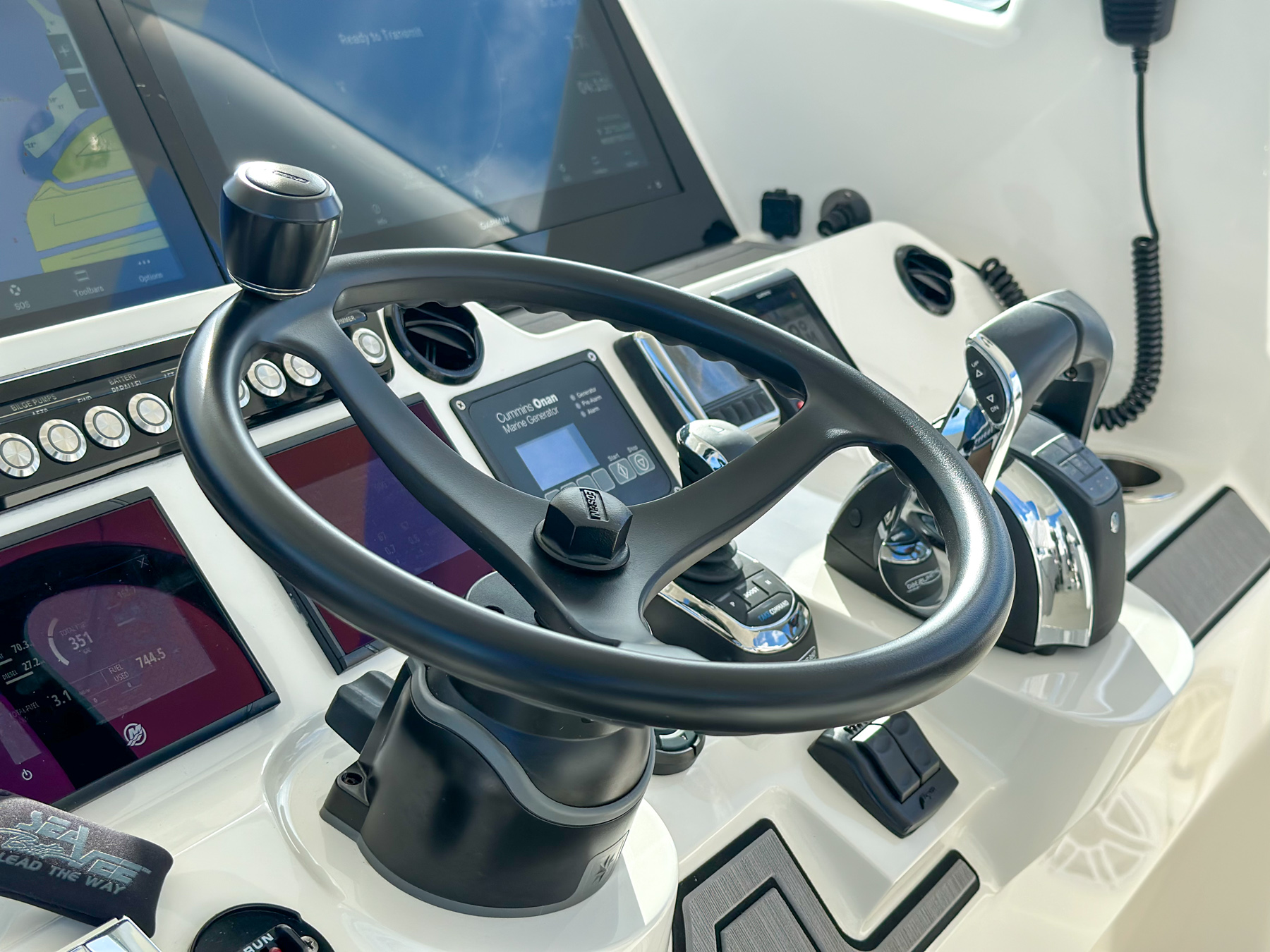 The 450z features SeaVee’s award winning twin stepped, cross-ventilated hull with patented SpeedRail® technology. Multiple lifting bodies with unique geometry ensure a fixed trim angle throughout a wide range of speeds. That’s a fancy way of saying you always have a clear view of the horizon, maximum fuel efficiency, more speed and safe predicable handling when making hard turns.