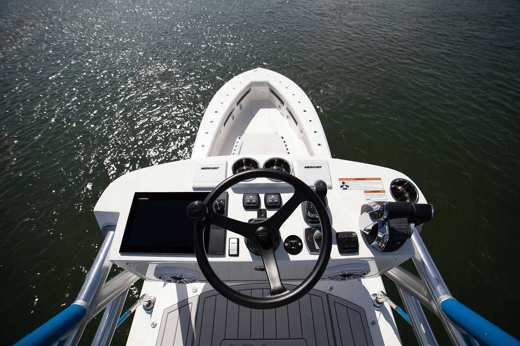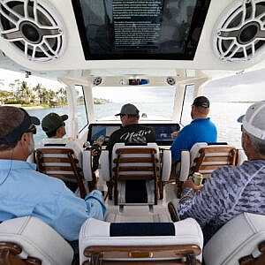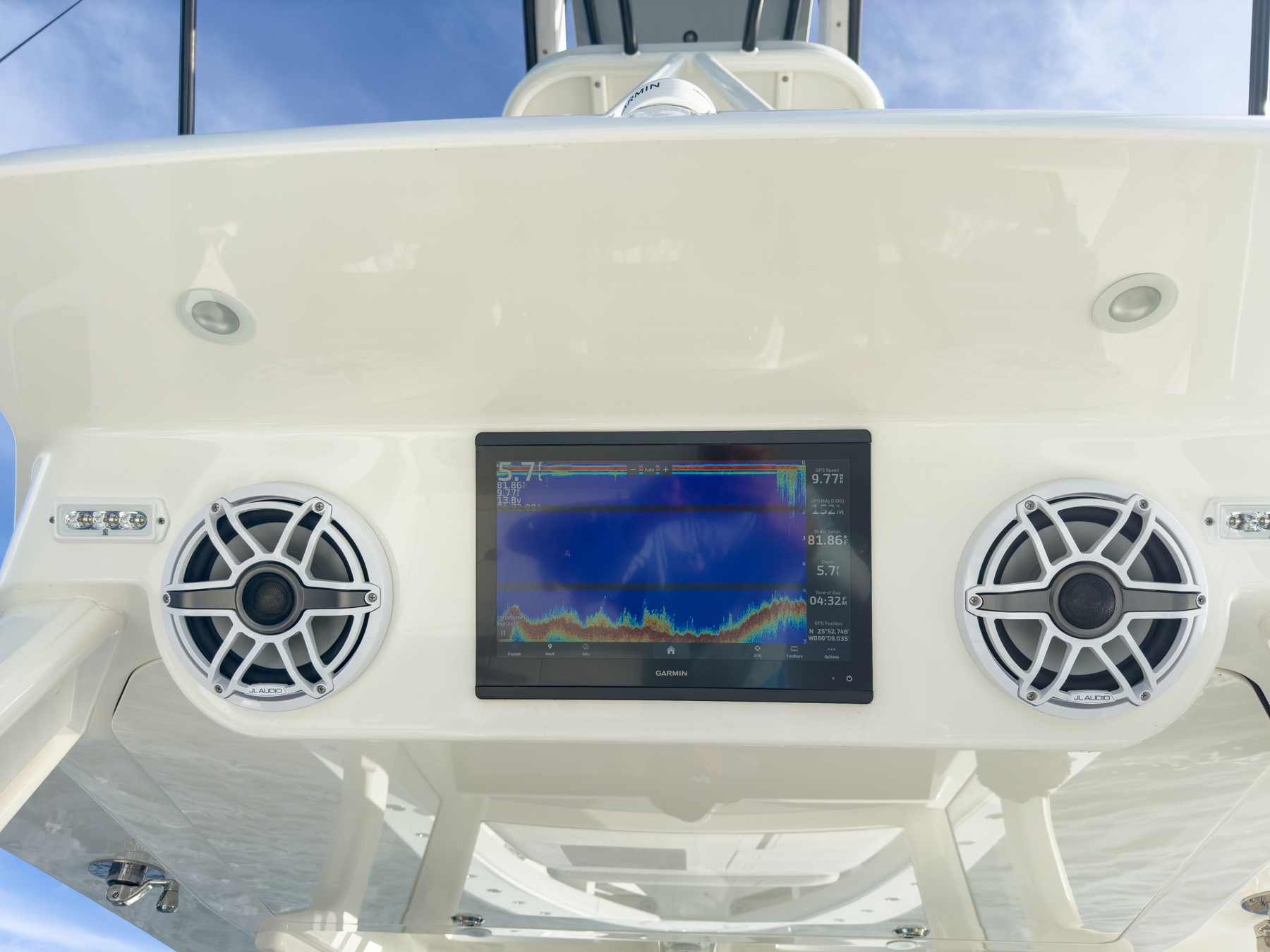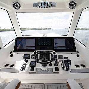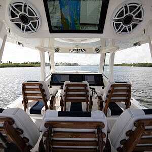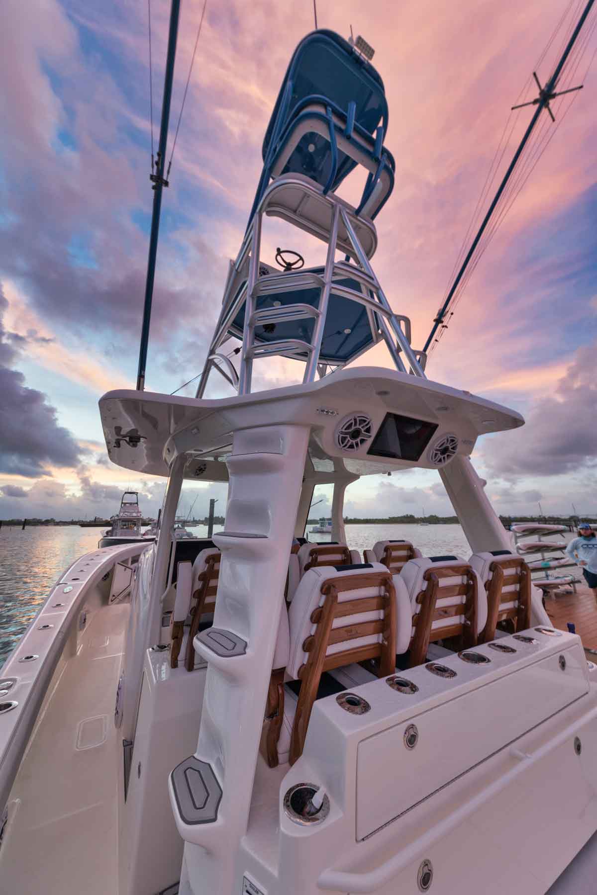 This integrated leaning post, t-top and console offer a modern helm, seating for 6, abundant tackle storage and a sliding fiberglass cooler.