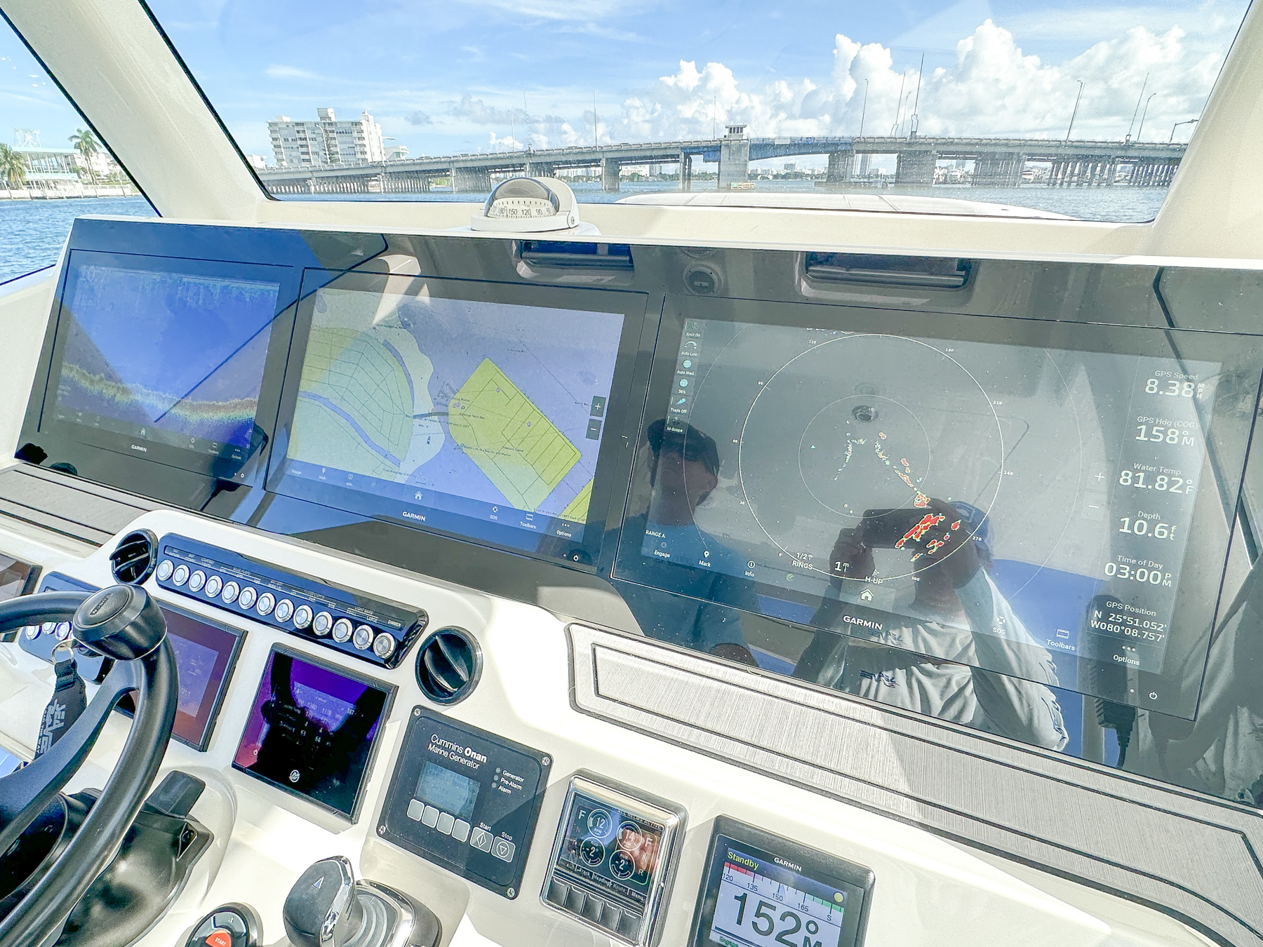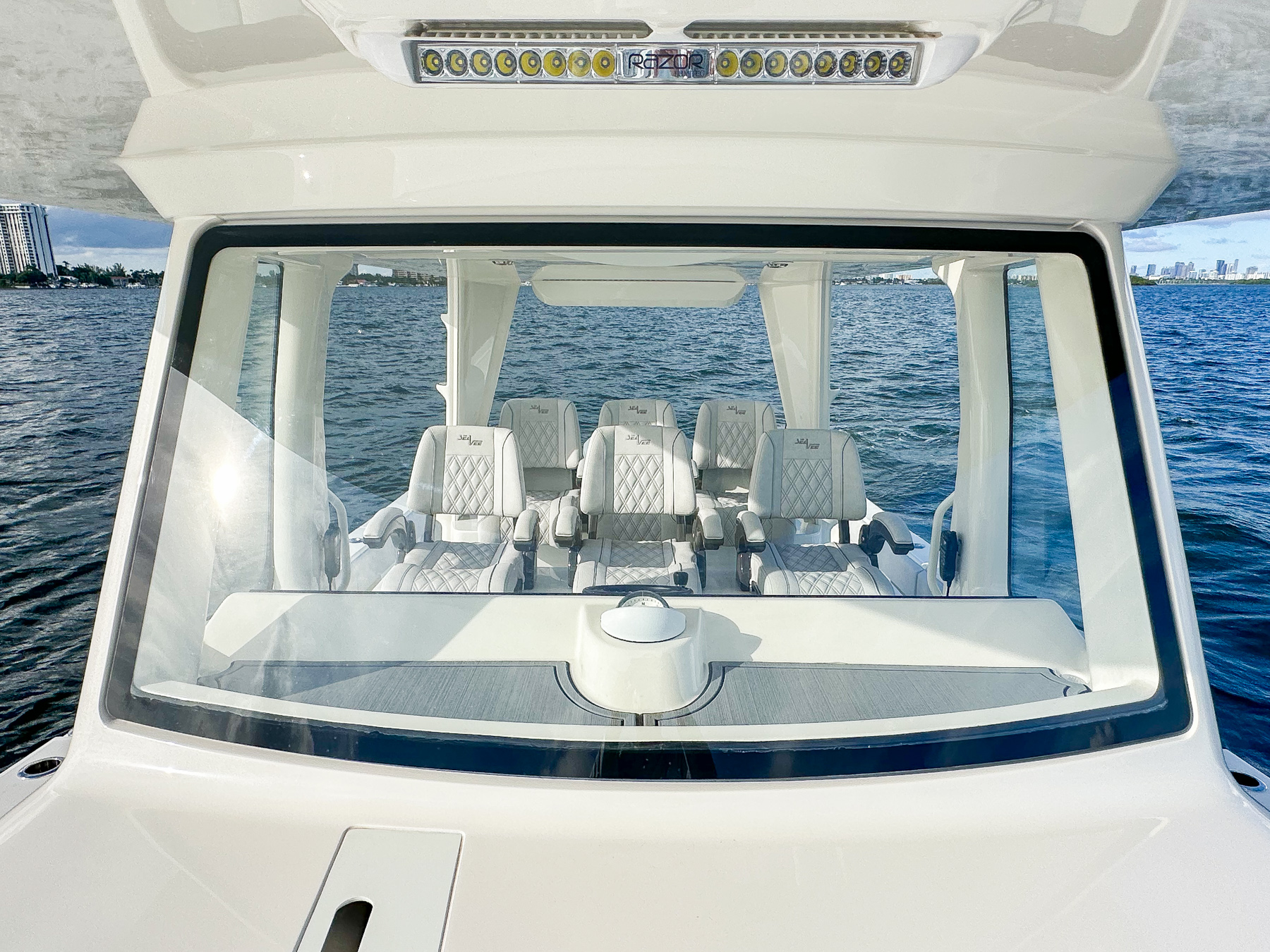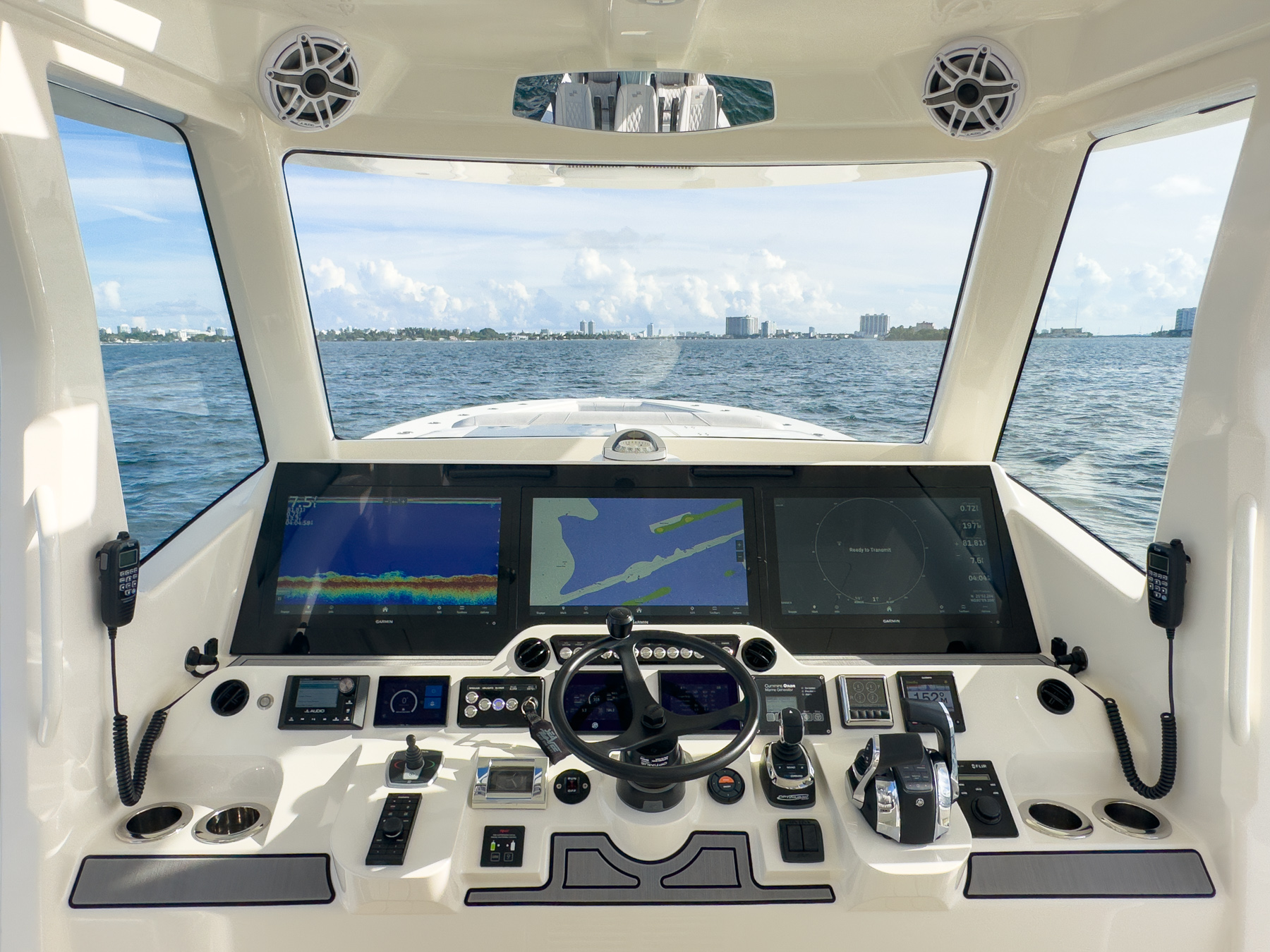 The 450’z maxi console is resin infused all in one piece and includes an integrated custom molded safety glass windshield system. An oversized dash can accommodate practically any electronics package with up to three 22” displays.