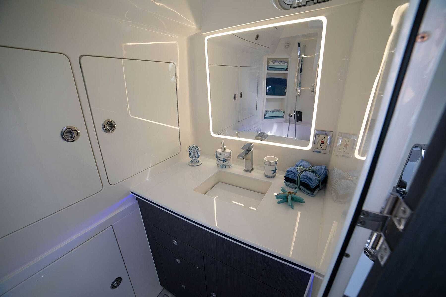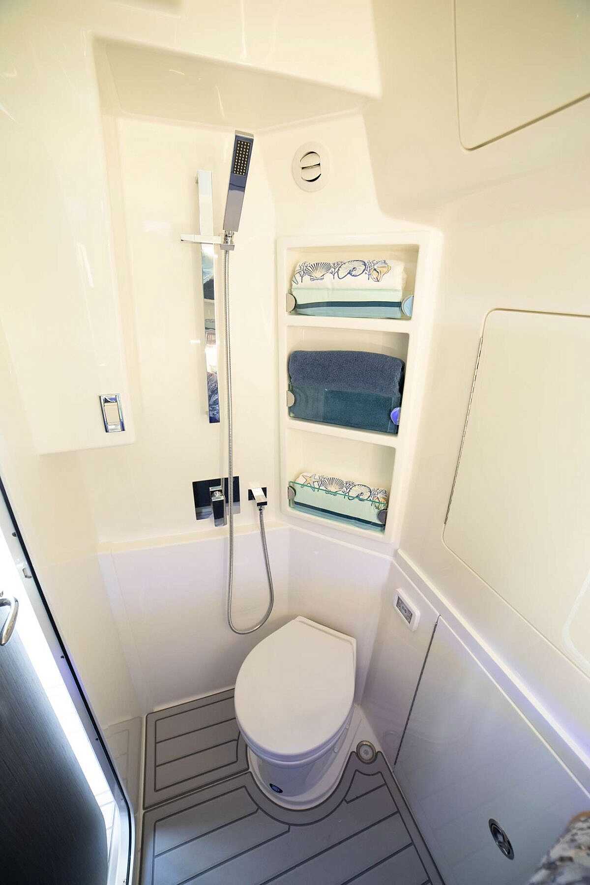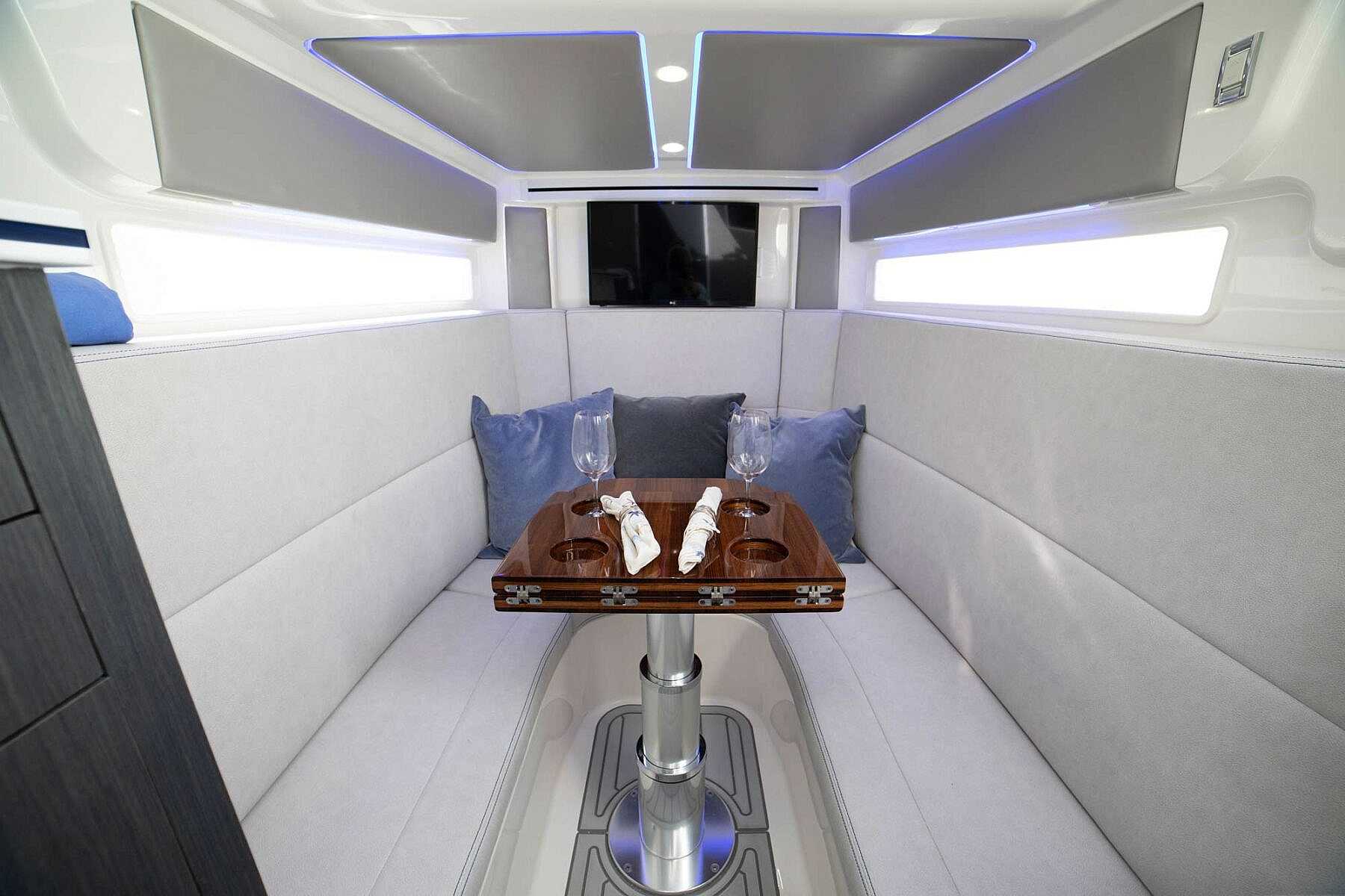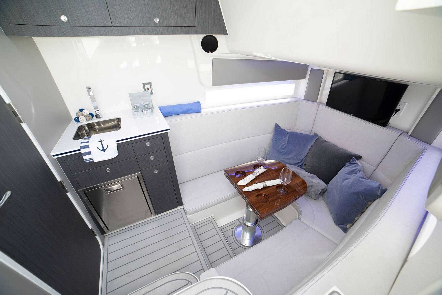 The cabin on the 450z features a marine head complete with vanity and shower, a galley with refrigeration and a convertible seating area.