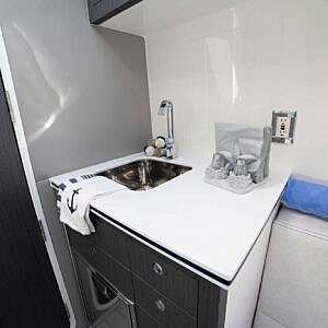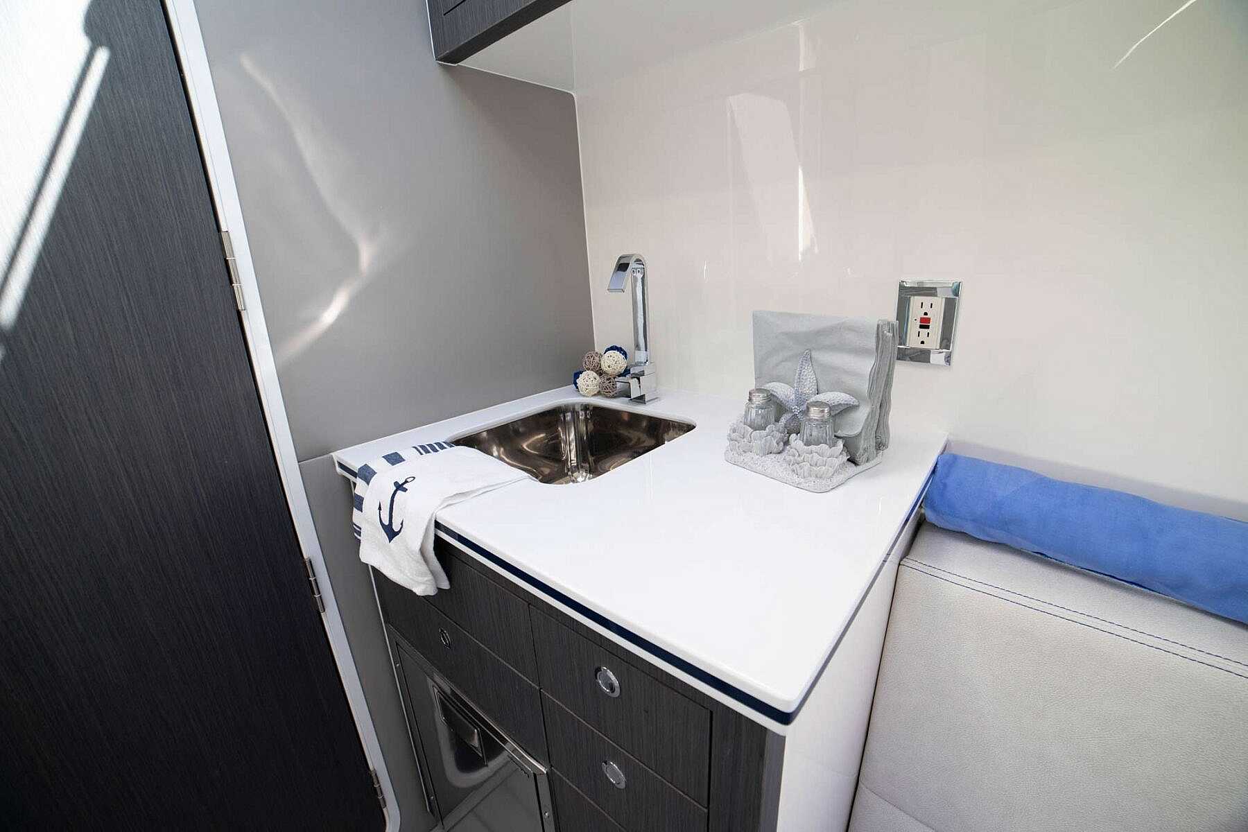 - Custom wood veneer galley cabinets, with microwave and drawer refrigerator